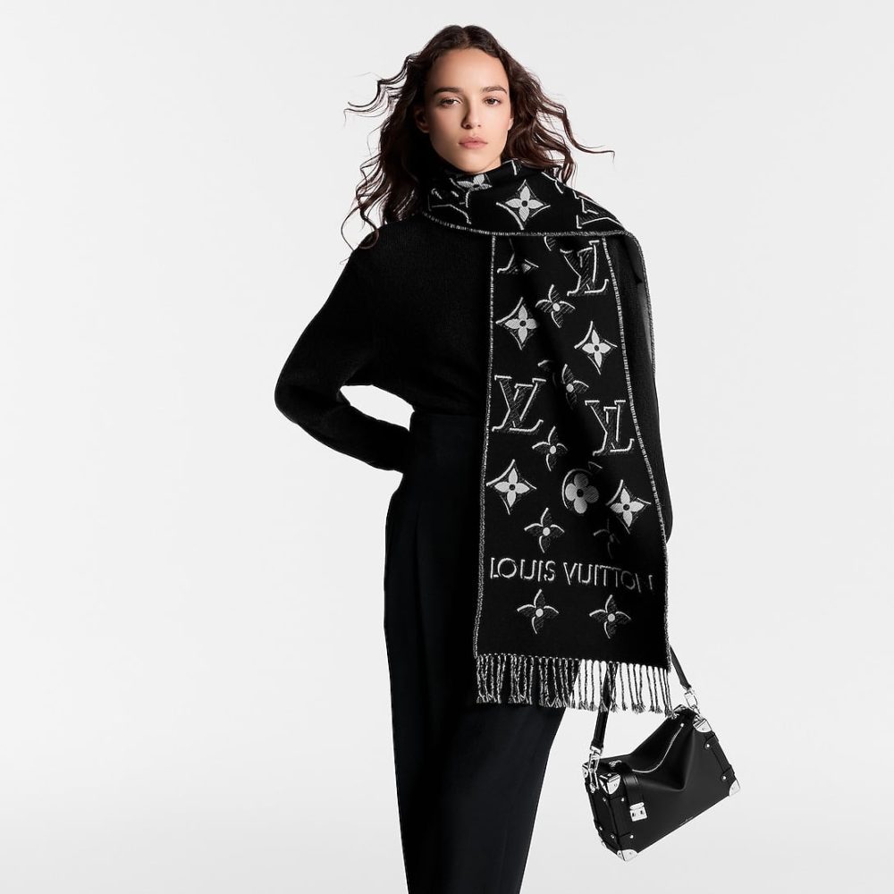 The LV Essential Shine scarf offers a casual alternative to the Reykjavik and Logomania scarves. An eye-catching twist on the Monogram pattern has been meticulously crafted with a shimmering effect thanks to the addition of metallic fibers. Fringed edges add a sleek finishing touch to this luxuriously soft accessory.