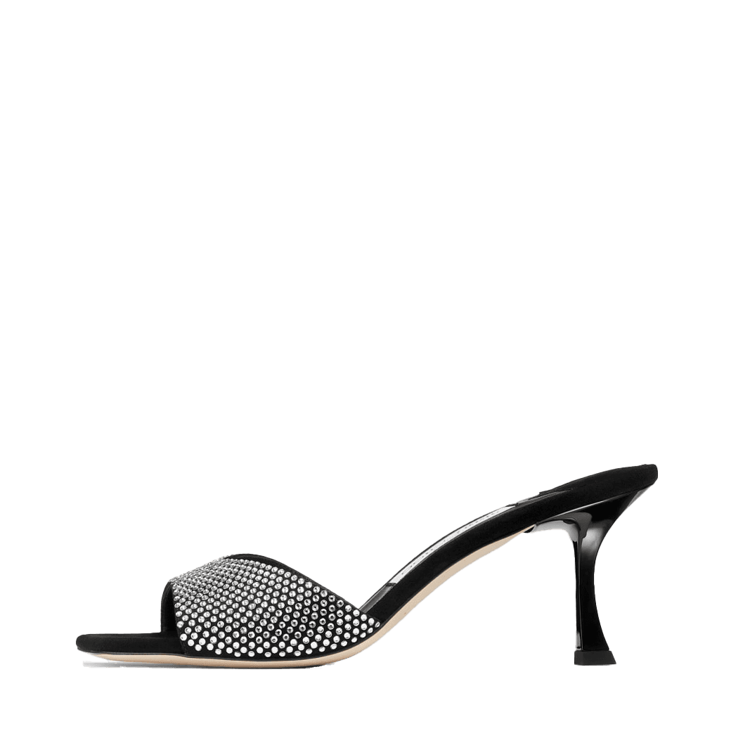 Crafted from crystal-embellished suede, the Skye sandal is a standout design. Its modern silhouette features a low-cut vamp with a square toe and a graphic curved heel.