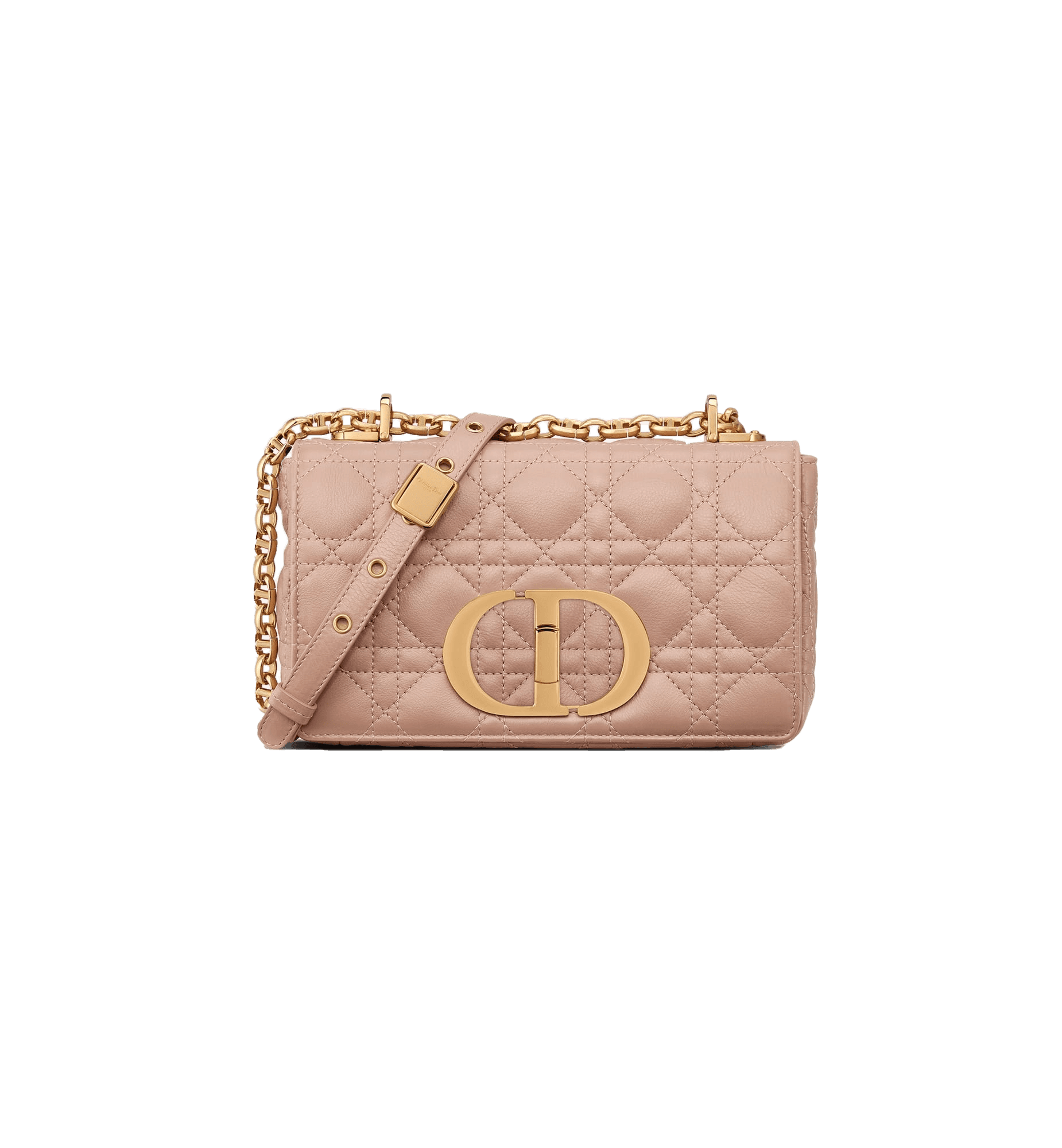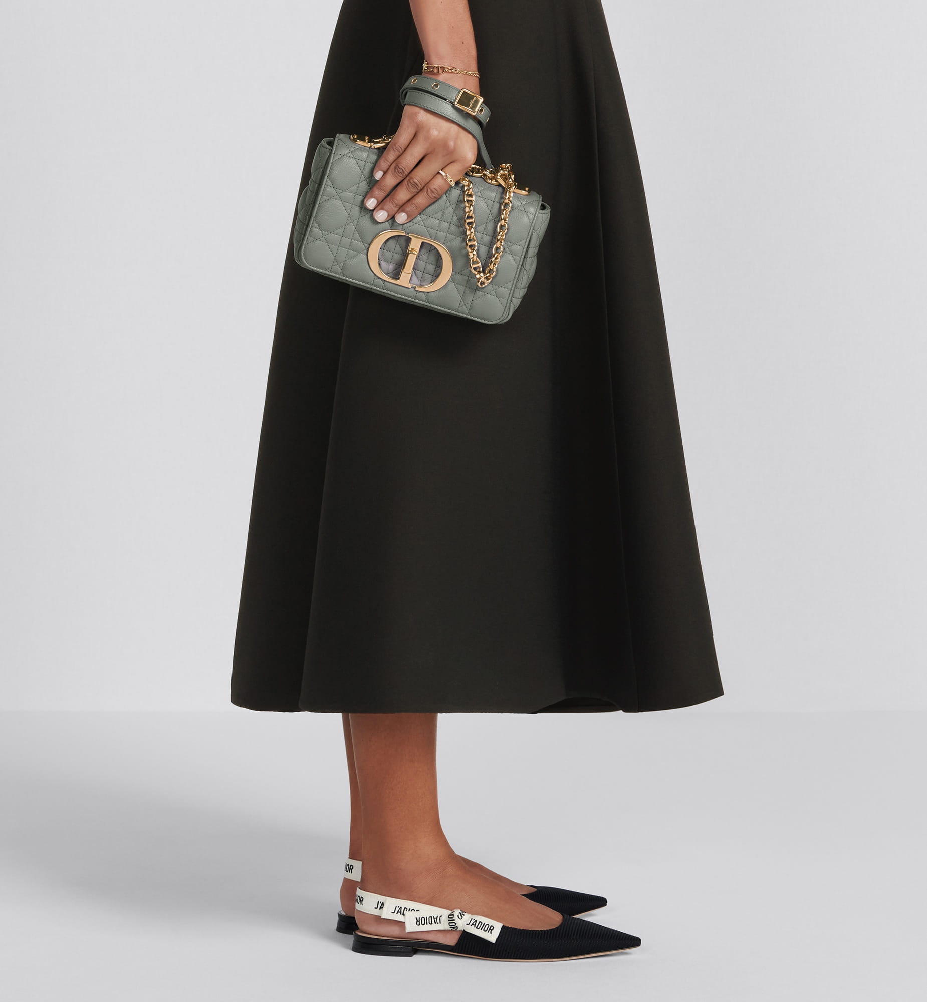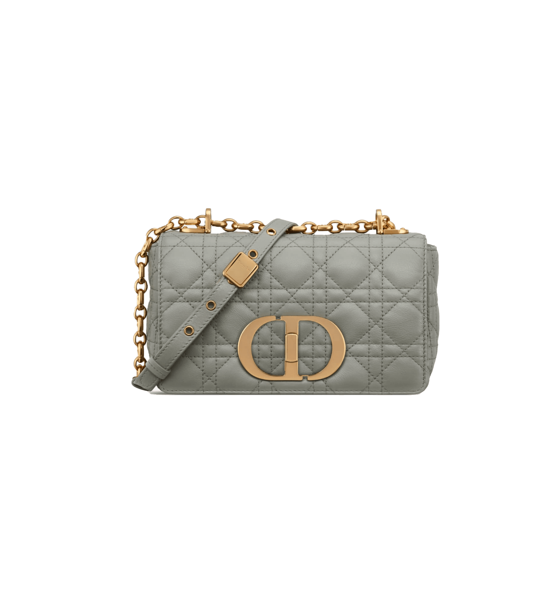 The Dior Caro bag combines modernity with timeless elegance. The style is crafted in black supple calfskin with Cannage stitching. The bag showcases a flap adorned with an antique gold-finish metal CD twist clasp, inspired by the seal of a Christian Dior perfume bottle. The detachable chain shoulder strap with CD signature links allows the small bag to be carried by hand, worn over the shoulder or crossbody, and may be replaced by one of the House’s wide embroidered straps for day or evening attire.