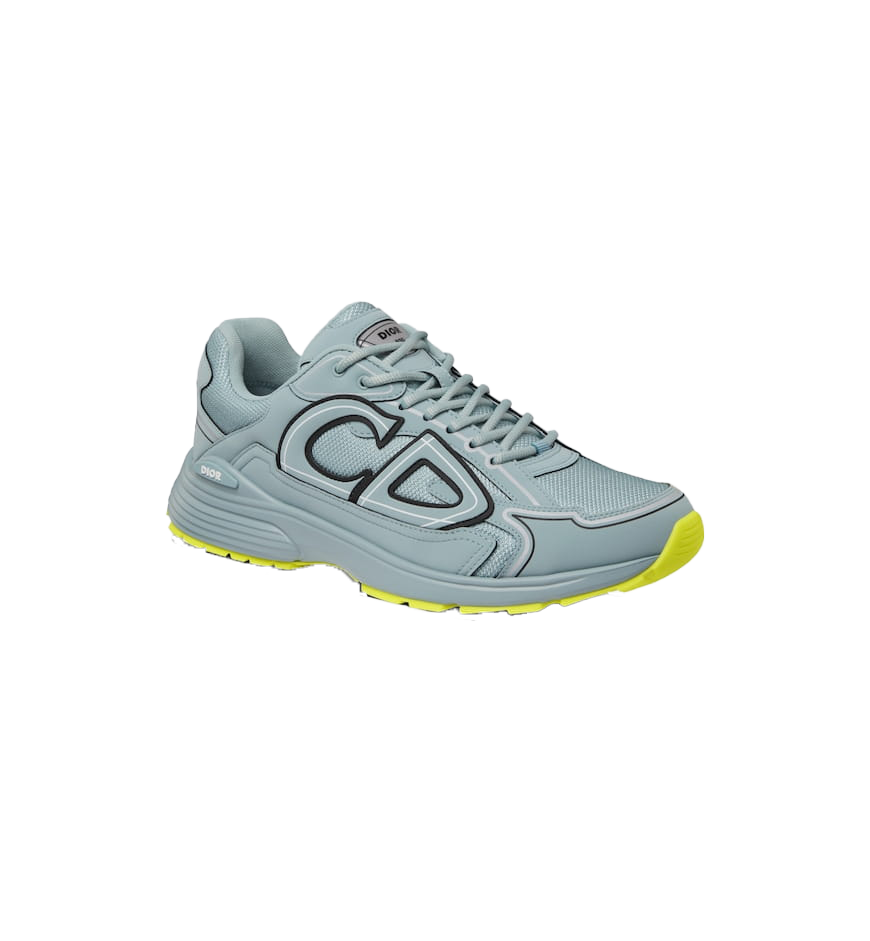 The B30 sneaker has become a new House essential distinguished by its modern and sporty silhouette. Crafted in blue mesh and technical fabric, it is enhanced by a reflective tonal CD30 signature with a graphic aesthetic. The B30 also features silver-tone Dior B30 and CD30 signatures on the tongue and the back of the sneaker. A blue sculpted rubber sole with fluorescent yellow edging features various hallmark