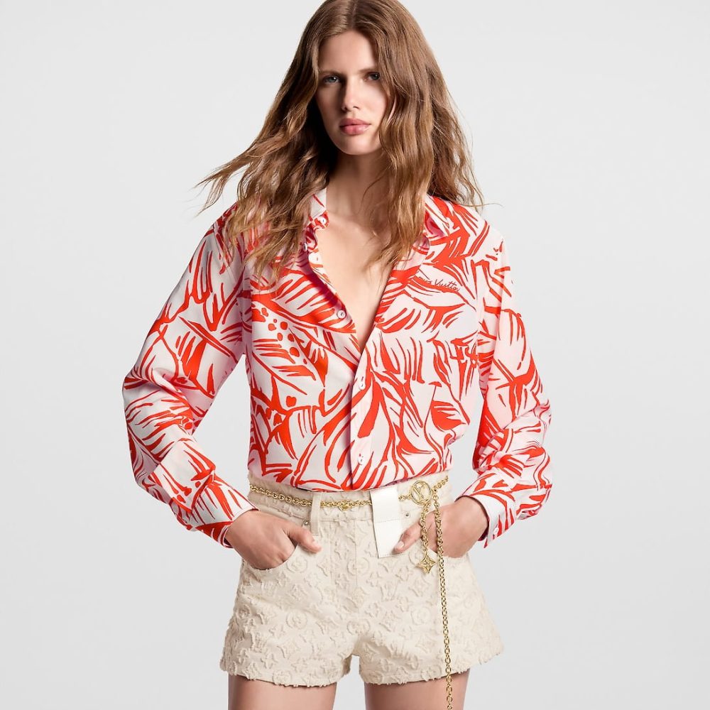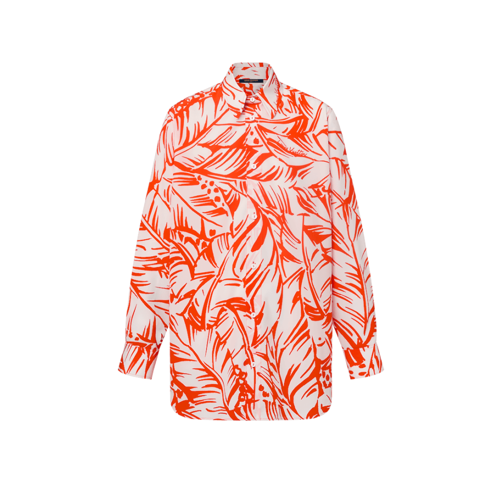 This silk shirt is vibrantly uplifted by the LV By the Pool collection’s graphic palm motif in a punchy hue. Tailored from soft silk in a clean straight cut with a smart collar and buttoned cuffs. Louis Vuitton lettering discreetly peppers the print and a Monogram Flower tab adds a final signature to the left cuff.