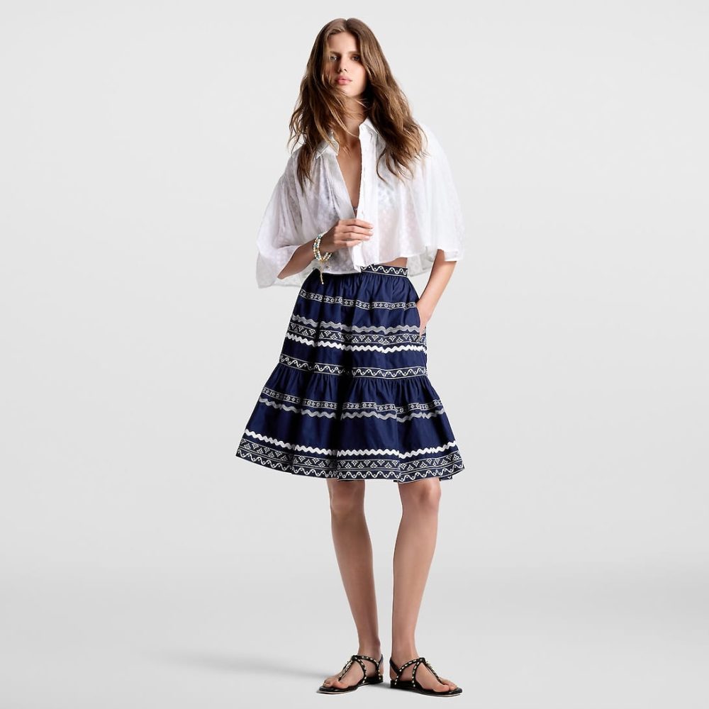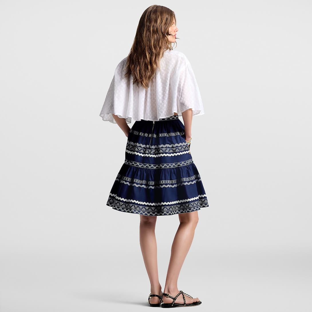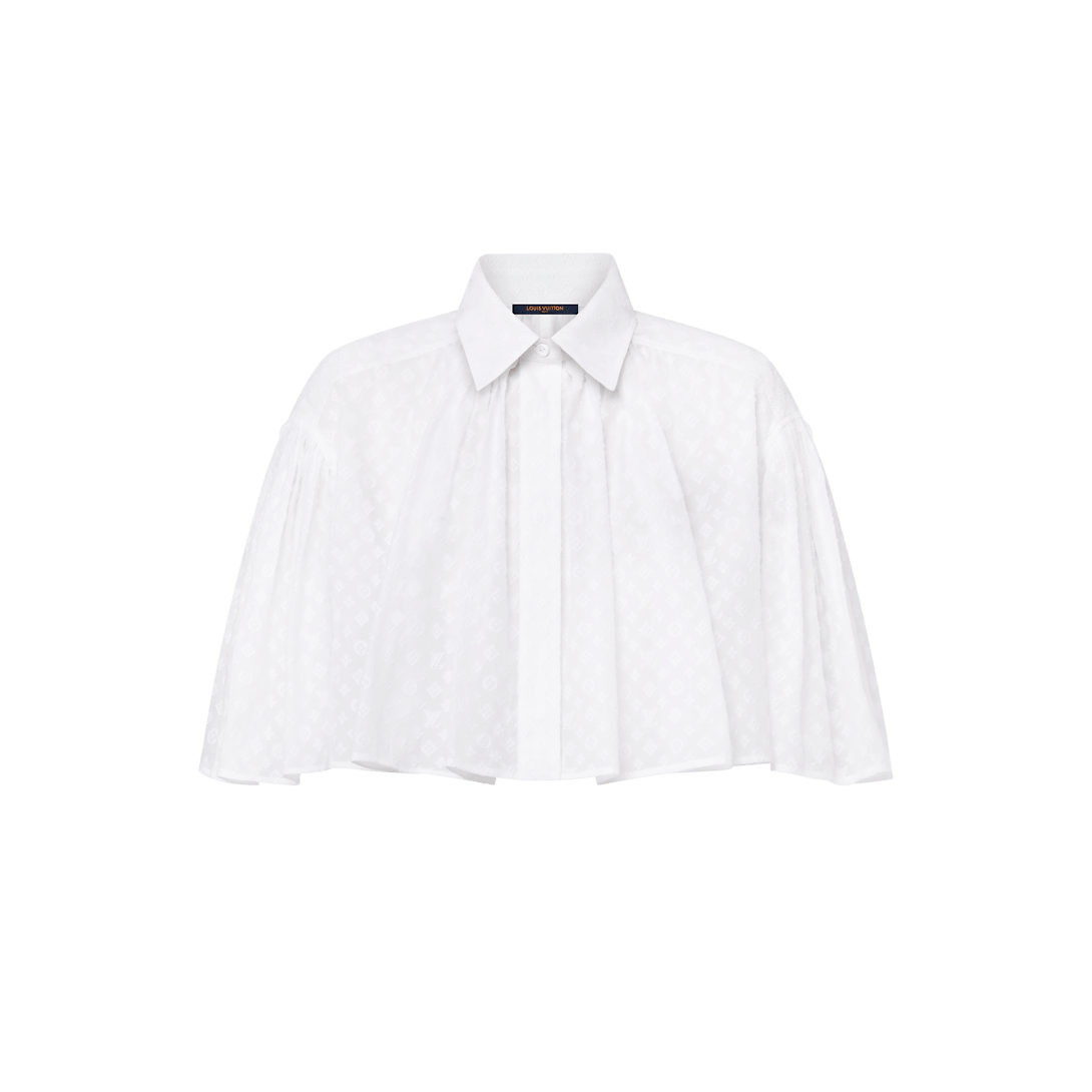 A fresh seasonal signature from the LV By the Pool collection uplifts this breezy blouse with a romantic feel: Crafted from a lightweight cotton-silk blend, the iconic Monogram motif features all over in fil coupé. A smart collar and covered button tab introduce a classic tailored touch to the airy cropped cape silhouette.