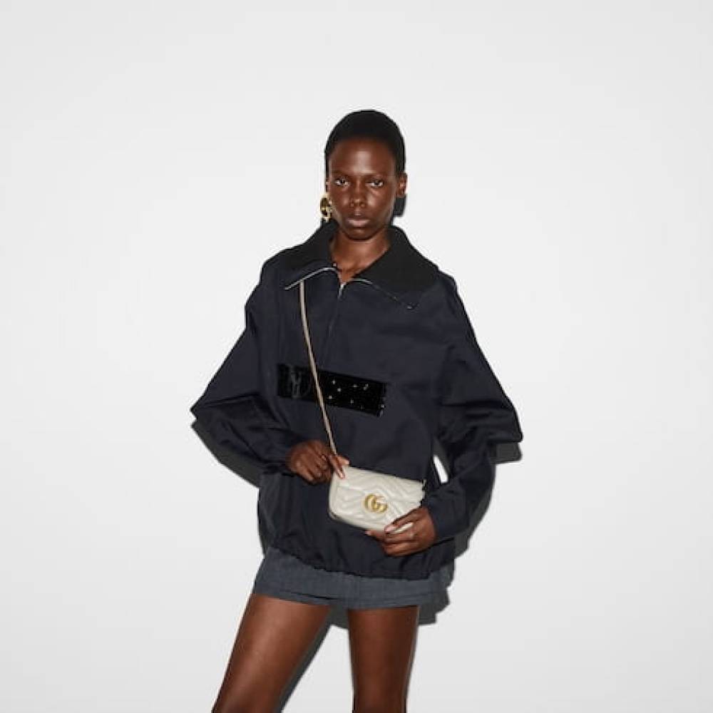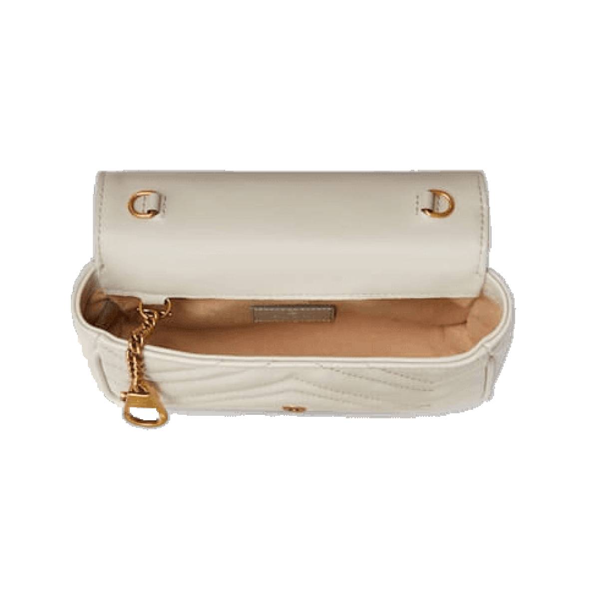 Crafted from ligt grey matelassé chevron leather, this super mini bag is defined by the emblematic Double G logo in antique gold-toned hardware. A key ring that can be used to attach the accessory to a separate bag completes the style.