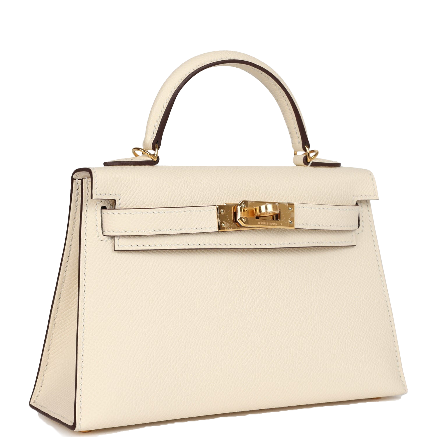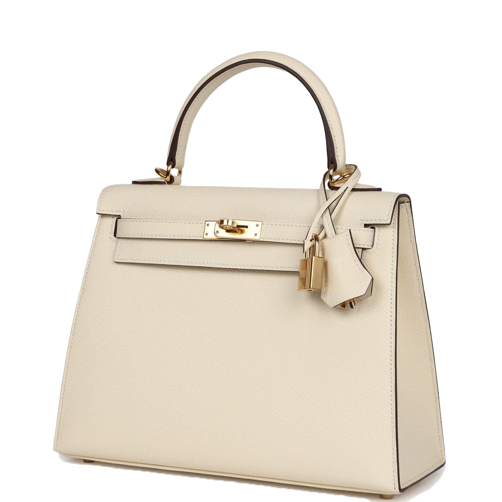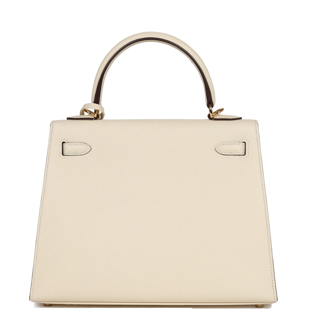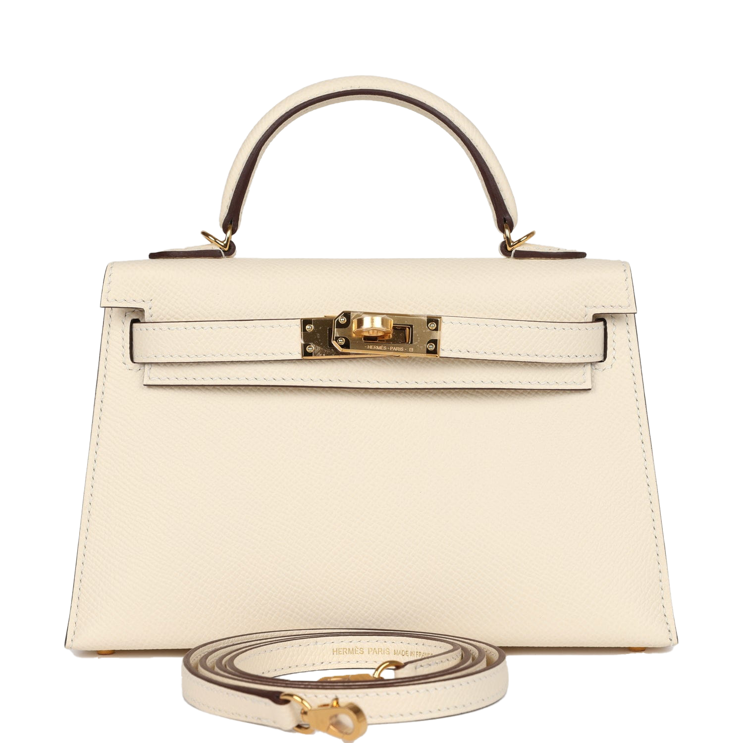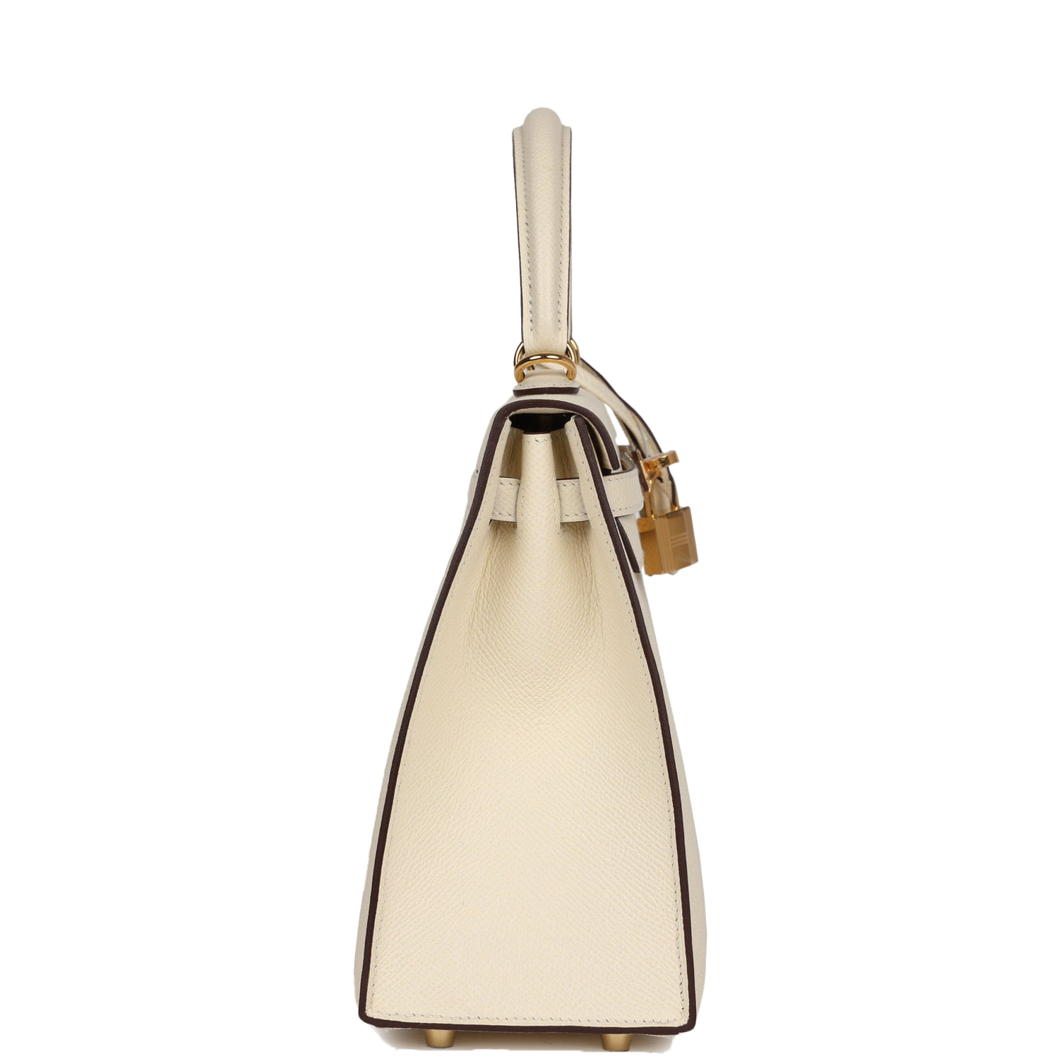 This Kelly, in the Sellier style, is in Nata epsom leather with gold hardware and has tonal stitching, two front straps with toggle closure, clochette with lock and two keys, single rolled handle and removable shoulder strap.