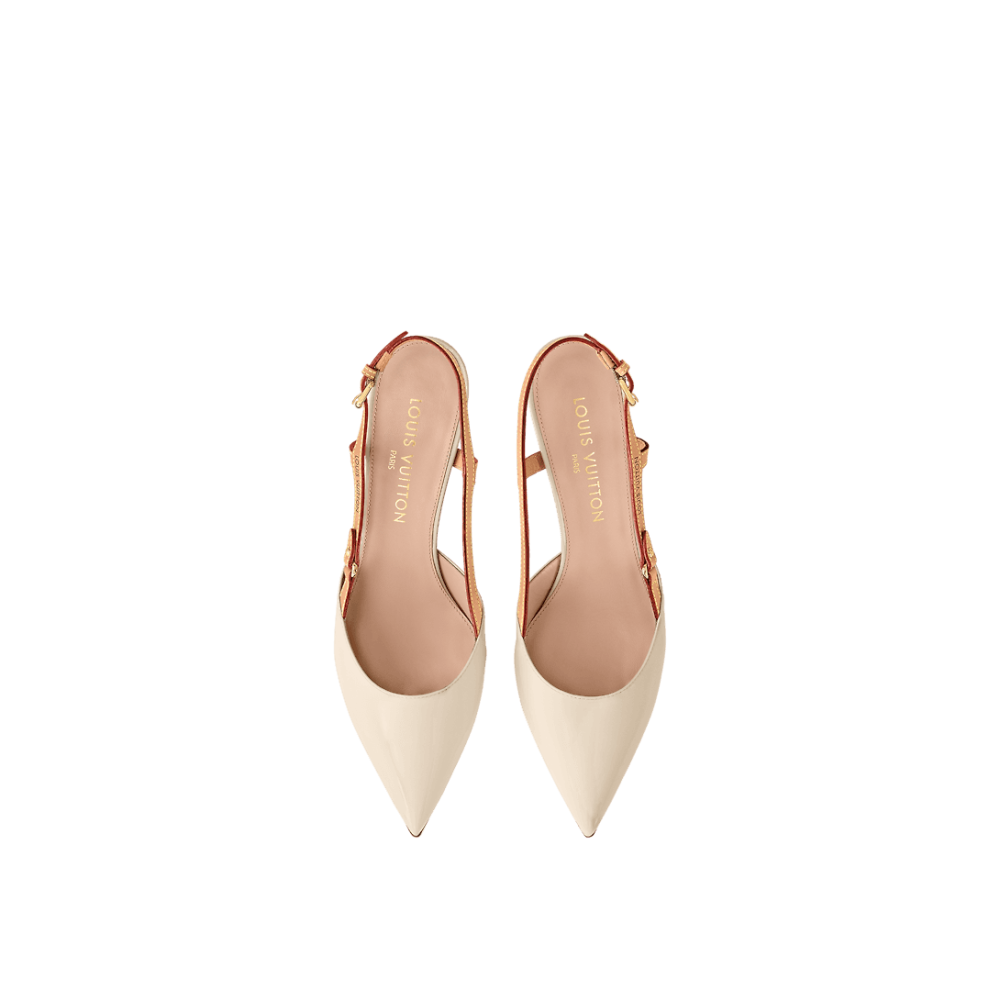 The Blossom slingback pump contrasts an upper in high-shine patent calf leather with a natural leather strap bearing the Louis Vuitton signature. This model is notable for its graceful heel in the shape of a round Monogram Flower. The back strap is embellished with an engraved, gold-tone stud and adjusted with a tiny buckle.