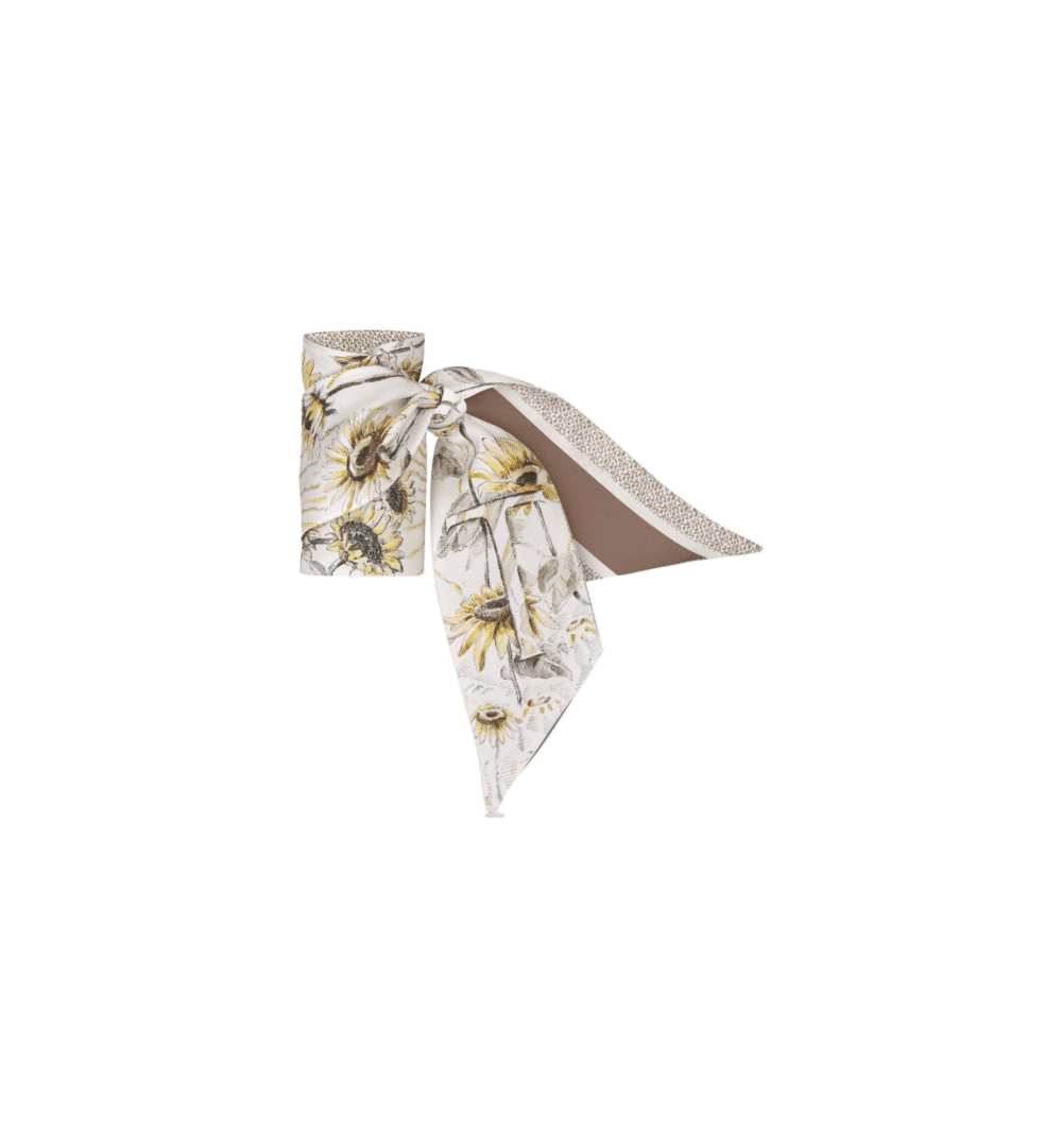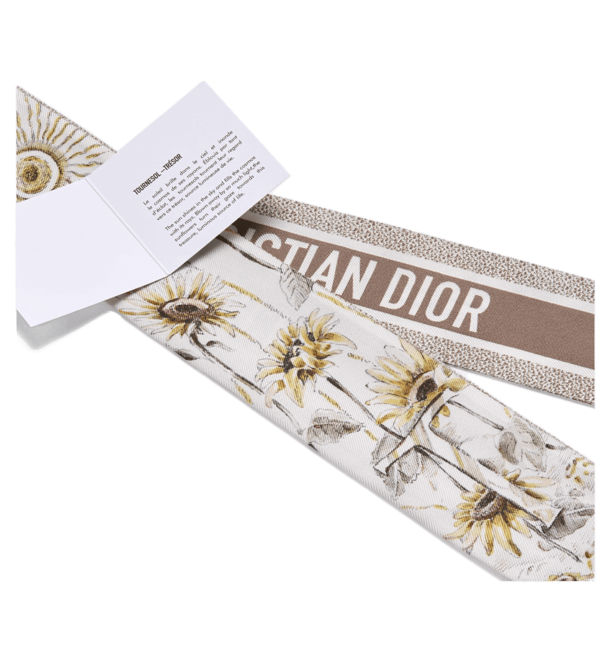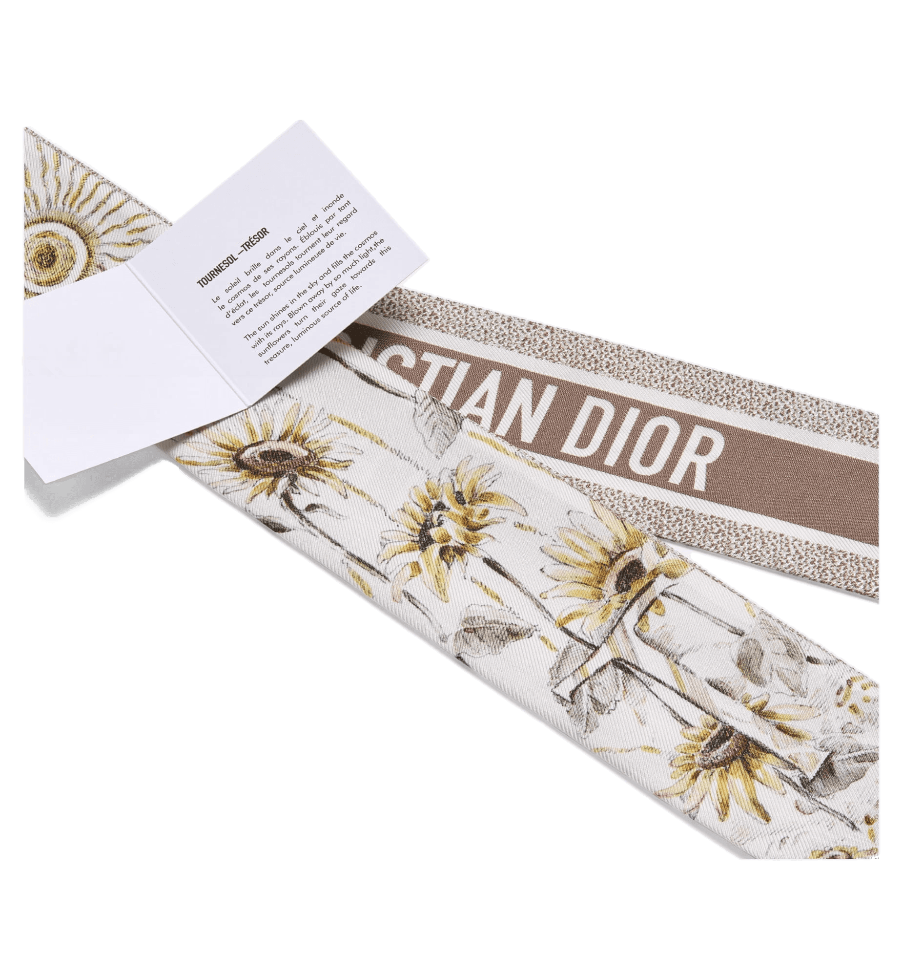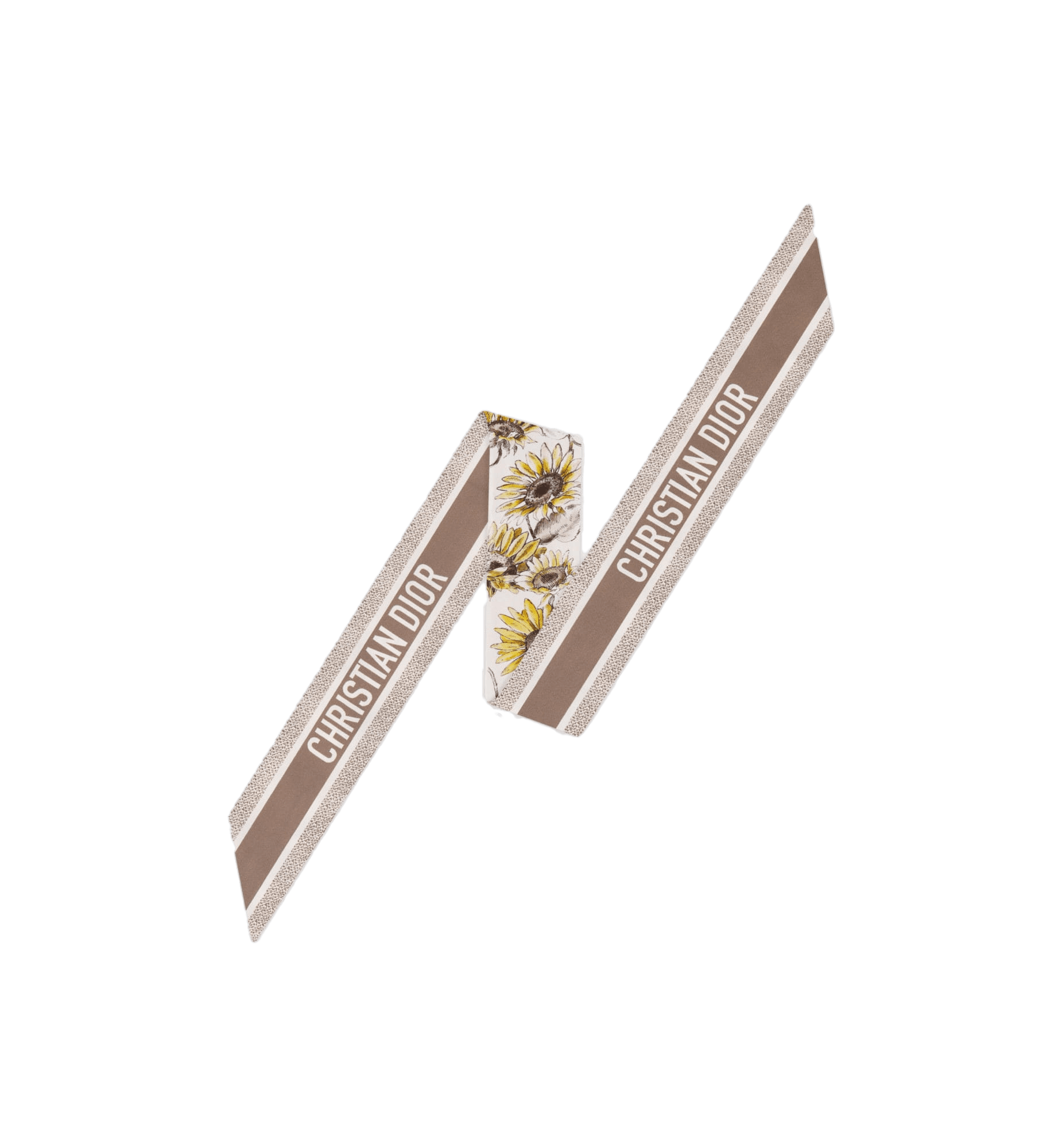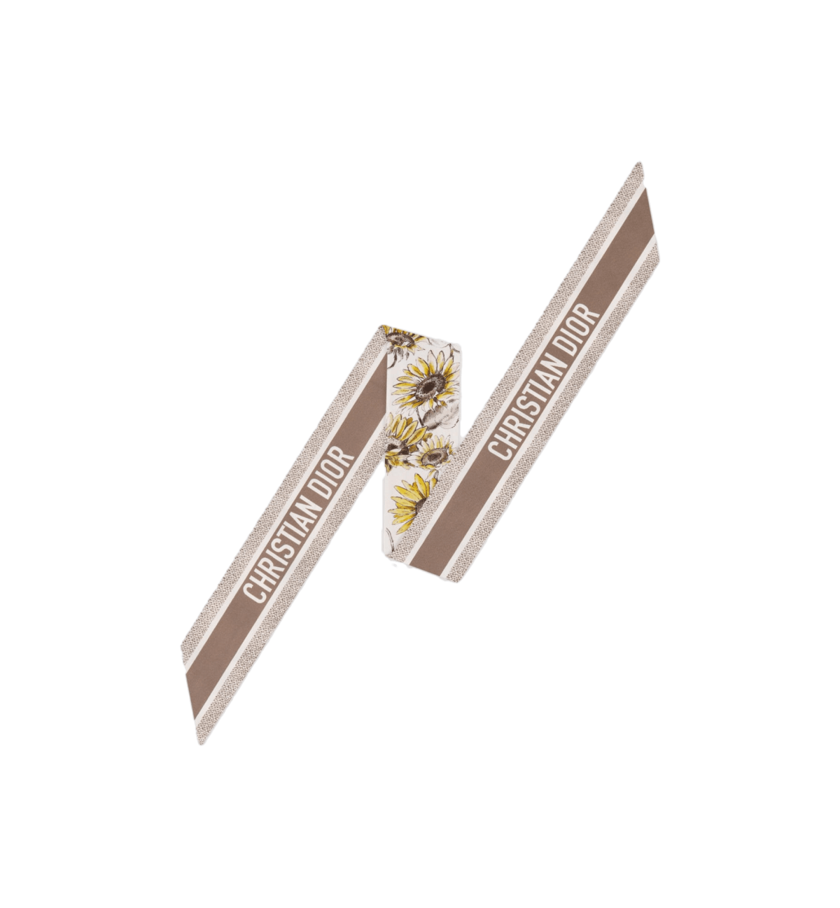 The ABCDior Mitzah scarf, crafted in silk twill, showcases one of 26 flowers that represent Christian Dior’s love of nature. A passion that flourishes like never before upon Maria Grazia Chiuri’s delicate creations in a celebration of botanical beauty. The sun shines in the sky and fills the cosmos with its rays. Blown away by so much light, the sunflowers turn their gaze towards this treasure, luminous source of life. Enhanced by a contrasting Christian Dior signature jacquard band on the back, the ivory multicolor Mitzah scarf adds the finishing touch to any look and may be tied around the neck, at the wrist or on a bag.