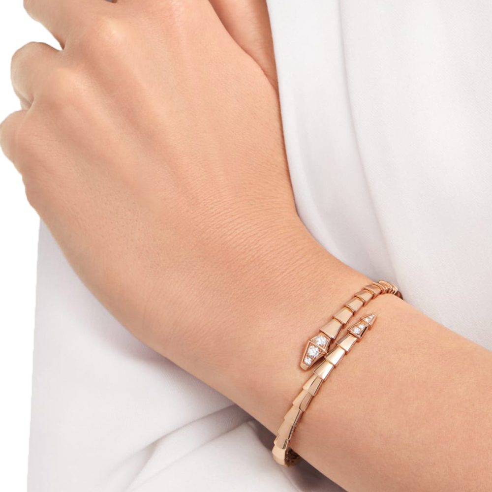 With its signature blend of pure aesthetics, enveloping shapes and charismatic flair, the Serpenti Viper 18 kt rose gold bracelet with demi pavé diamonds is an essential interpretation of Bvlgari’s icon of endless metamorphosis. Capturing the powerful and ever-evolving nature of the mythical serpent, the magnetic jewelry creation inspires us to embrace change as a source of strength and self-confidence. Easy to mix and match, the bracelet offers endless styling options, embodying the collection’s versatile spirit.