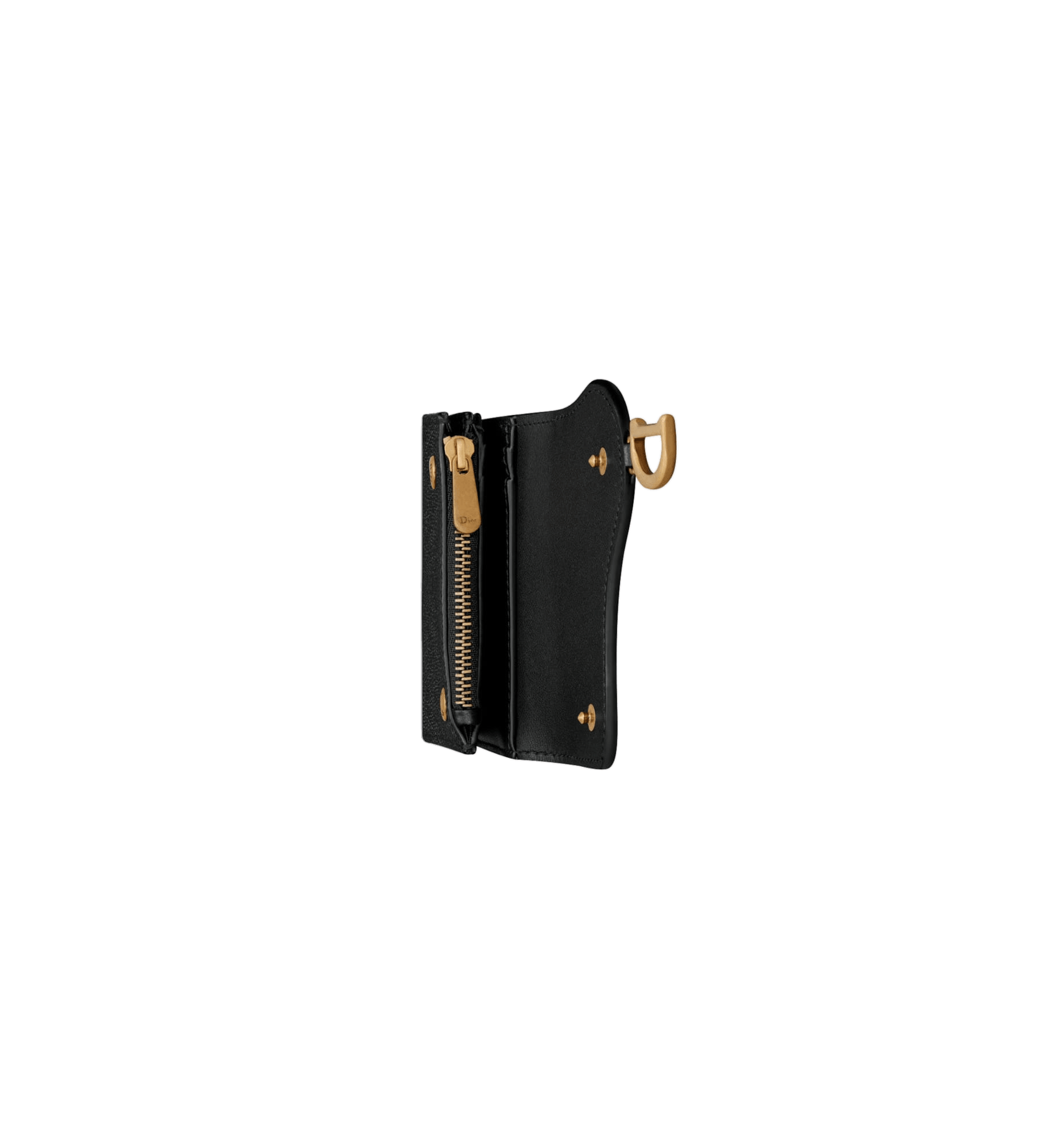 The Saddle Lotus wallet honors the namesake line’s emblematic codes. Crafted in black grained calfskin, it features the iconic asymmetrical flap and antique gold-finish metal D stirrup. The timeless accessory can hold all the essentials and may easily be slipped into any bag.