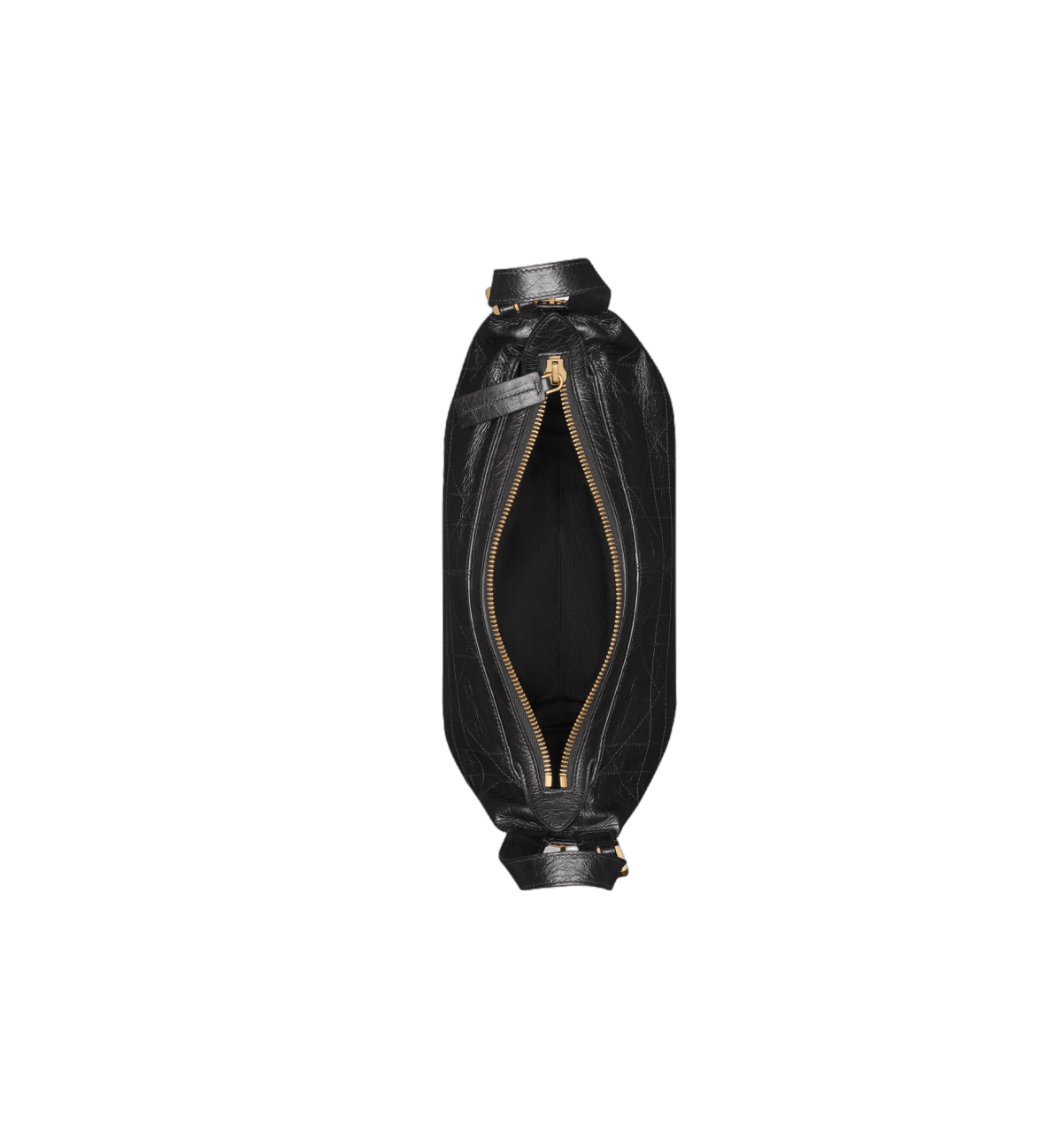 New for the season and presented at the Spring-Summer 2025 Ready-to-Wear Fashion Show, the D-Journey bag offers a new take on the hobo silhouette with a modern supple design. The style is crafted in black crinkled calfskin with Flat Macrocannage topstitching in an interpretation of the House’s iconic motif. The main compartment is completed by a zip pocket, while two decorative side pockets showcase a large leather pull with the Christian Dior Paris signature. Featuring adjustable leather top handles and a leather strap, the small D-Journey bag can be carried by hand, worn over the shoulder or crossbody as a daily companion.