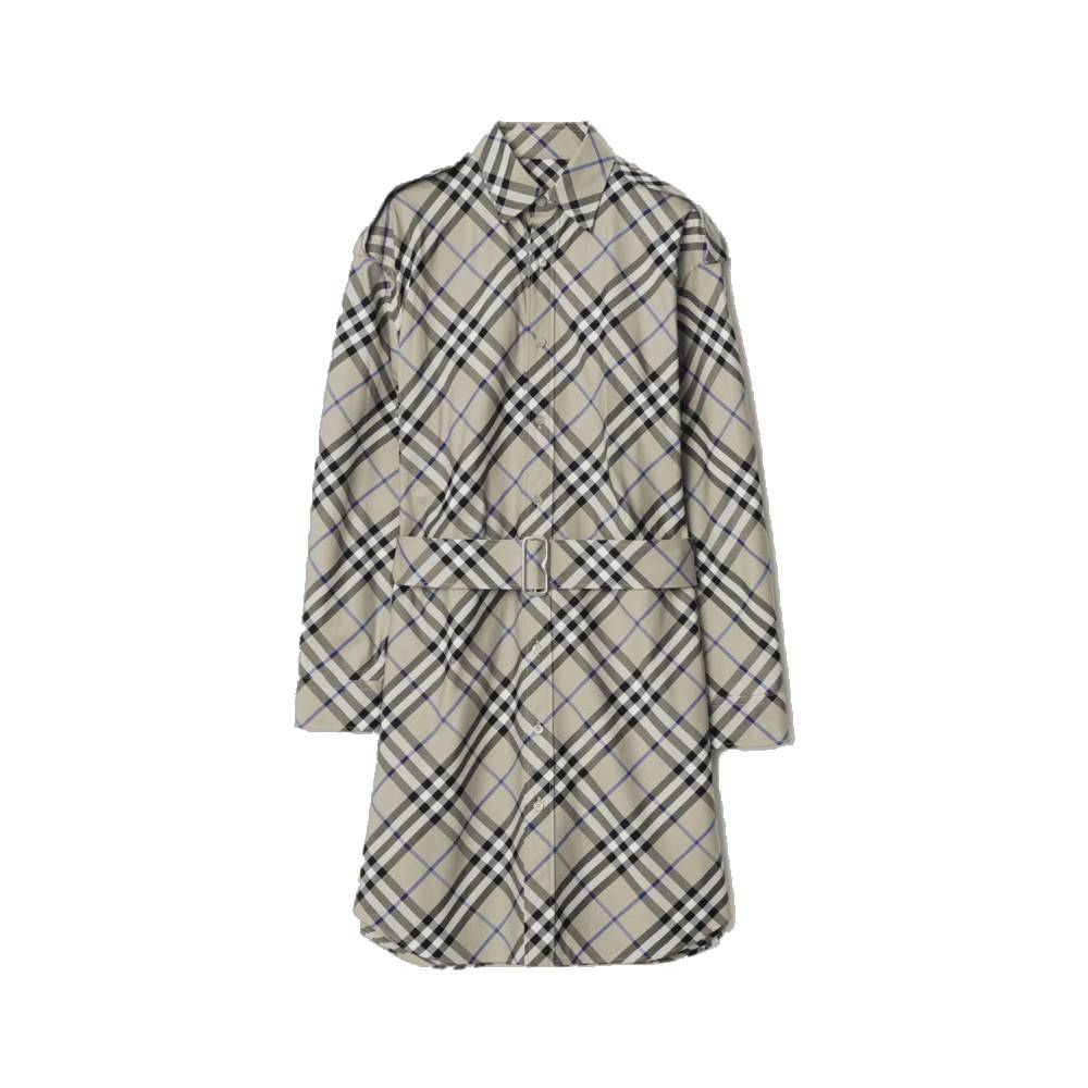 - A shirt dress in cotton twill, woven in Italy with the Burberry Check. The mid-length style is tailored to a relaxed fit with a B buckle belt to adjust the silhouette. Epaulettes at the shoulders are inspired by our signature trench. Part of Burberry Classics, wardrobe foundations with a unique Burberry slant.