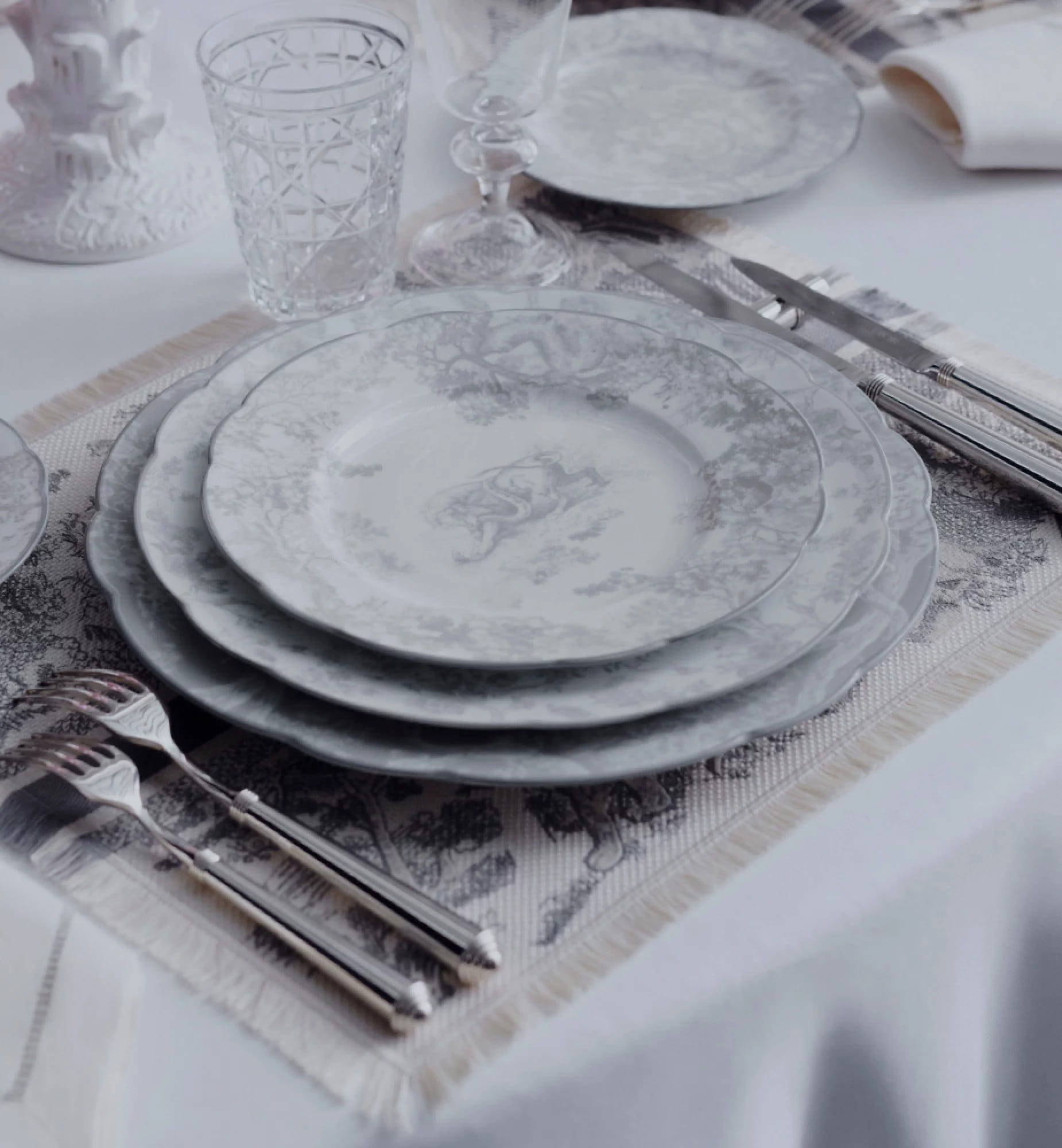 Dessert plate crafted in extra fine Limoges porcelain with a hand-painted filet border and Toile de Jouy Lion motif. A timeless motif and House code cherished by Christian Dior, Toile de Jouy is constantly reimagined and still adorns Dior Maison’s creations as a tribute to the founding couturier.