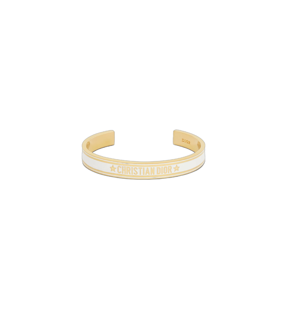 The Dior Code bangle offers a modern and iconic aesthetic. The rigid gold-finish metal design features a Christian Dior signature enhanced by white lacquer. The bracelet may be worn with other Dior Code creations.