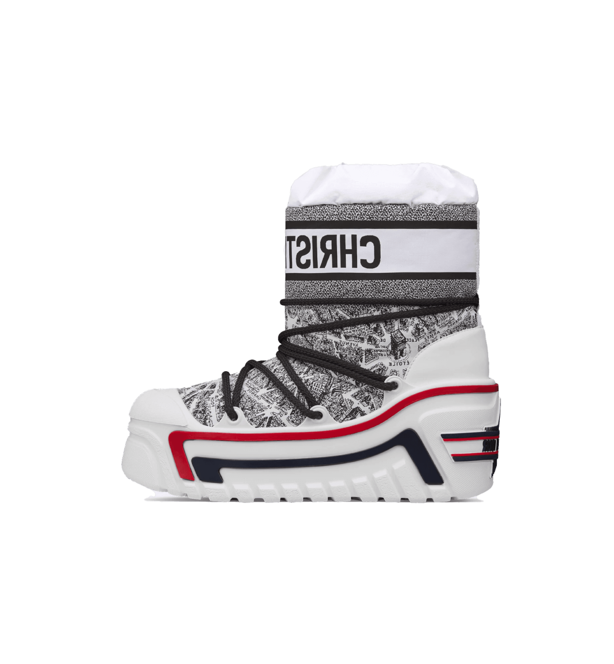 The après-ski boot, created for the DiorAlps capsule, is distinguished by its design. The white and black Plan de Paris shiny nylon upper is inspired by House archives and structured around Avenue Montaigne. Completed by cross lacing for an optimal fit, it showcases the Christian Dior signature on the upper as well as the supple and lightweight white three-tone sole, further embellished with a hallmark star. The technical ankle boot, with its low silhouette, may be worn in either the city or the mountains, and may be coordinated with other DiorAlps creations.