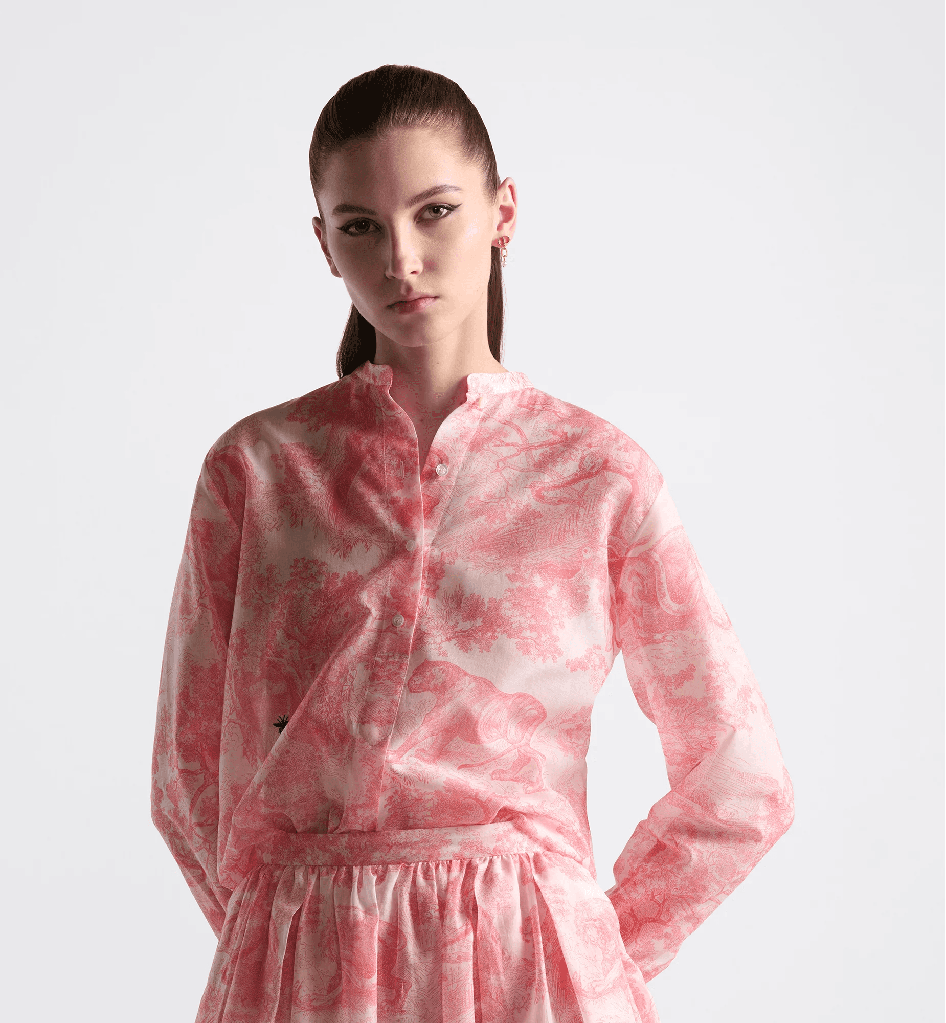 The blouse is part of the Dioriviera capsule and showcases the Toile de Jouy Sauvage motif, a variation of the hallmark House pattern. Crafted in white and candy pink cotton muslin, it features a modern silhouette that is longer in the back, an officer collar and a front button closure. The blouse can be styled with a leather belt to define the waist and with other Dioriviera creations to complete the look.