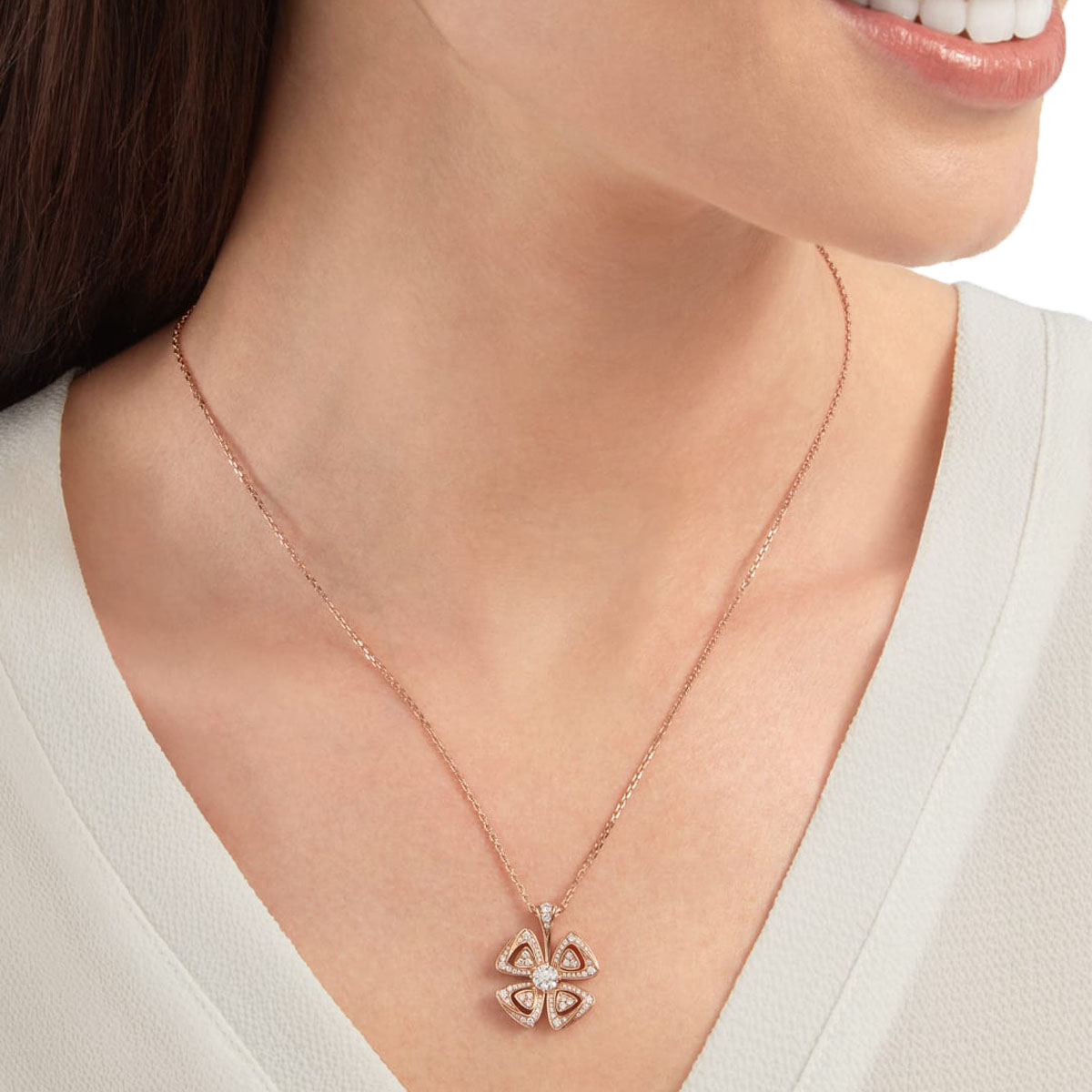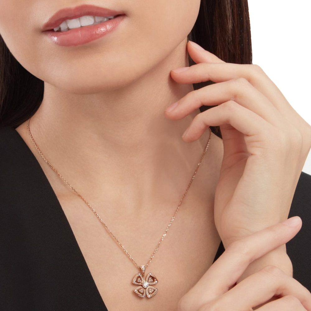 Blooming amongst the marvels of the Eternal City, Fiorever draws inspiration from the alluring four-petal flower cherished by the Romans as a symbol of happiness and joy. The blend of two meaningful words, Fiore, Italian for flower, and forever, Fiorever celebrates the Roman love for life with a striking, passionate design. Meant to sparkle with an eternal glow, Bvlgari’s precious floral icon is crafted with a central diamond embraced by four rose gold open-worked petals shimmering with pavé diamonds. Fiorever necklace in 18 kt rose gold with a diamond and pavé diamonds.