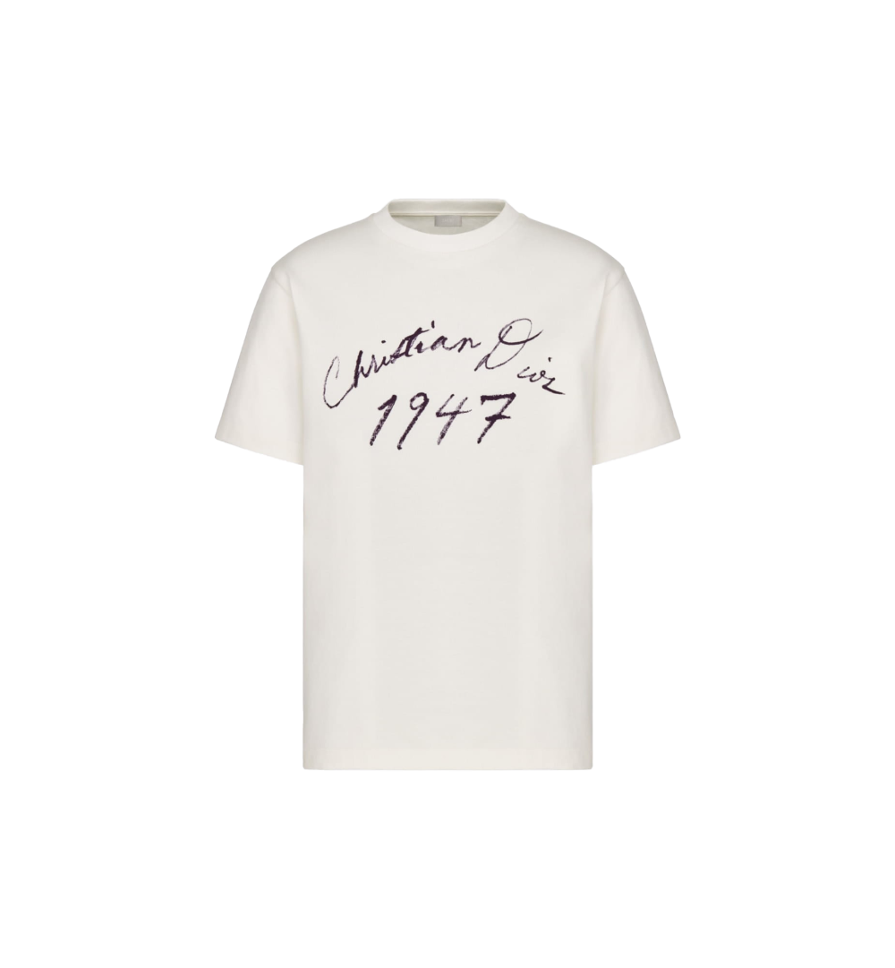 The T-shirt showcases the flocked handwritten Christian Dior 1947 signature displaying Mr. Dior’s signature along with the year of the House’s first collection. Made in white cotton jersey, it features a relaxed fit completed by a classic ribbed crew neck. The T-shirt will elevate any casual attire.
