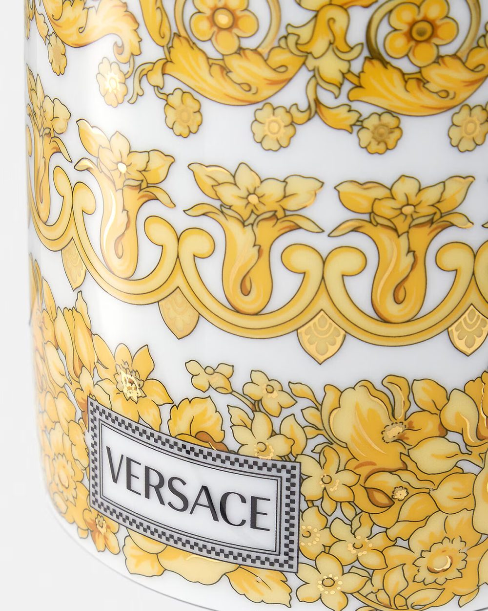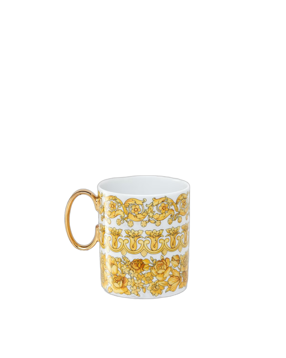 Part of the Medusa Rhapsody collection, this mug is characterized by a motif of Barocco flowers painted in golden shades. The mug is embellished by a Versace 90s Vintage logo label.