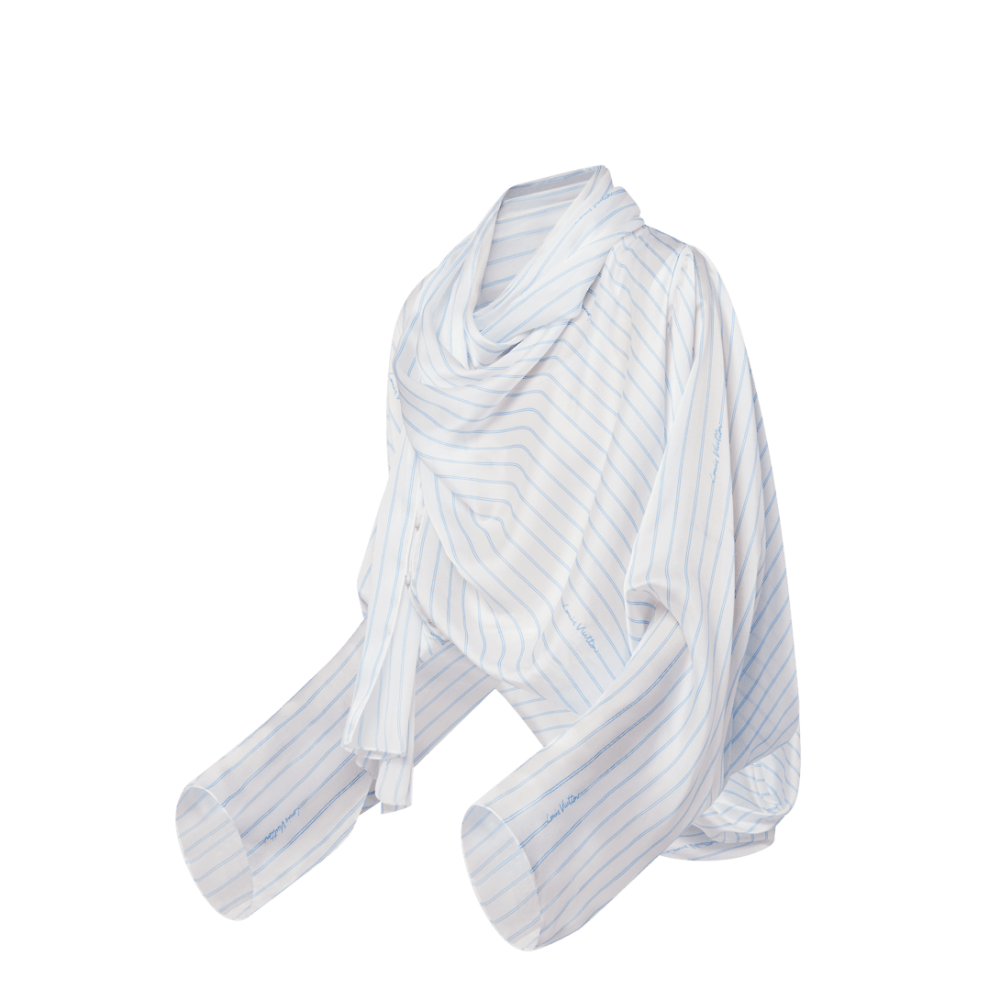 This elegant button-up blouse is crafted from fluid silk in a double-stripe motif peppered with Louis Vuitton signatures for a playful nod to classic tailoring codes. The silhouette is draped for an airy, deconstructed look, complete with a loose lavaliere neckline, gathered sleeves and an asymmetrical hemline.