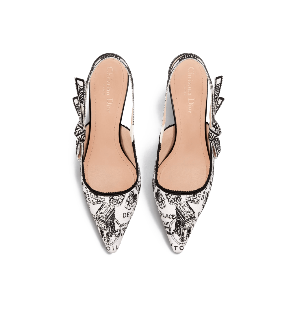 The J’Adior slingback pump is a prime example of Dior’s savoir-faire. The white and black embroidered cotton style showcases the season’s signature Plan de Paris motif, inspired by House archives and centered around Dior’s historic address on Avenue Montaigne. The J’Adior signature embroidered ribbon, bow and 6.5 cm (2.5) comma heel complete the elegant shoe, which can be paired with other Plan de Paris creations.
