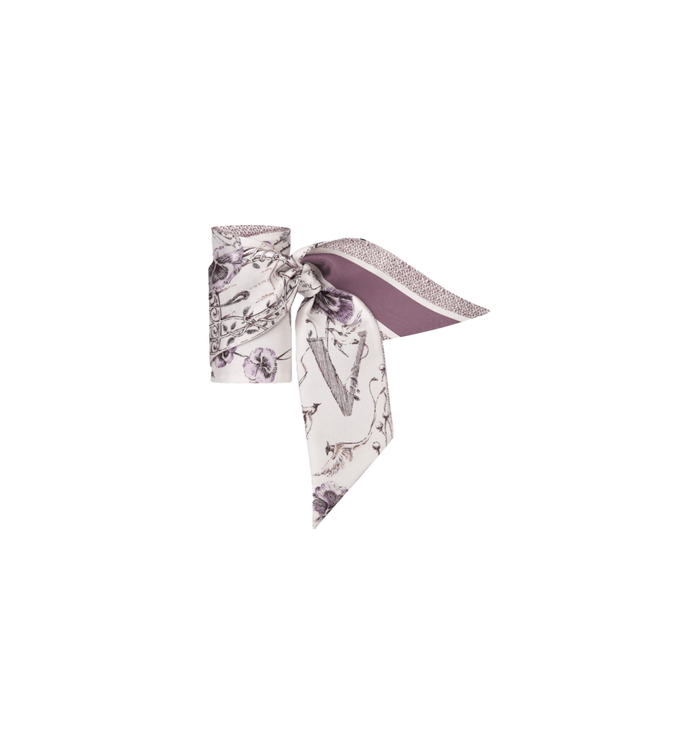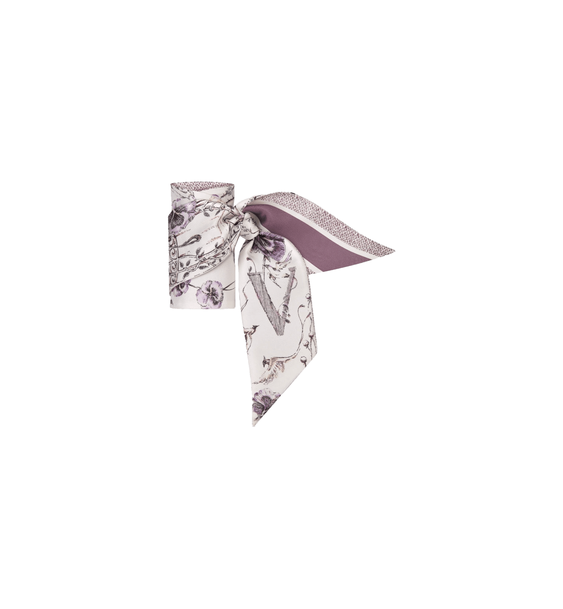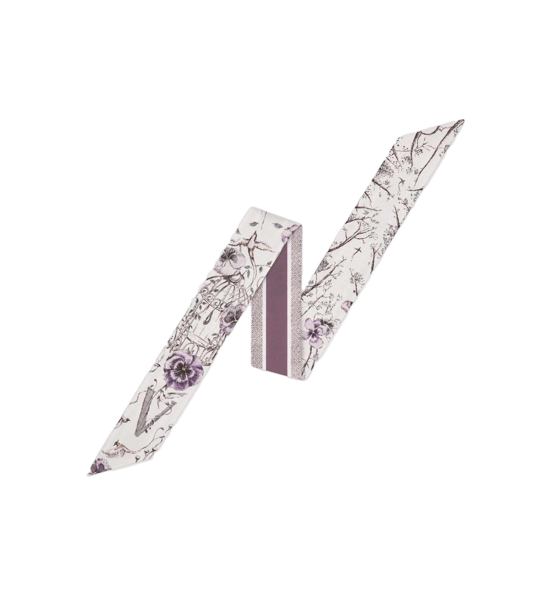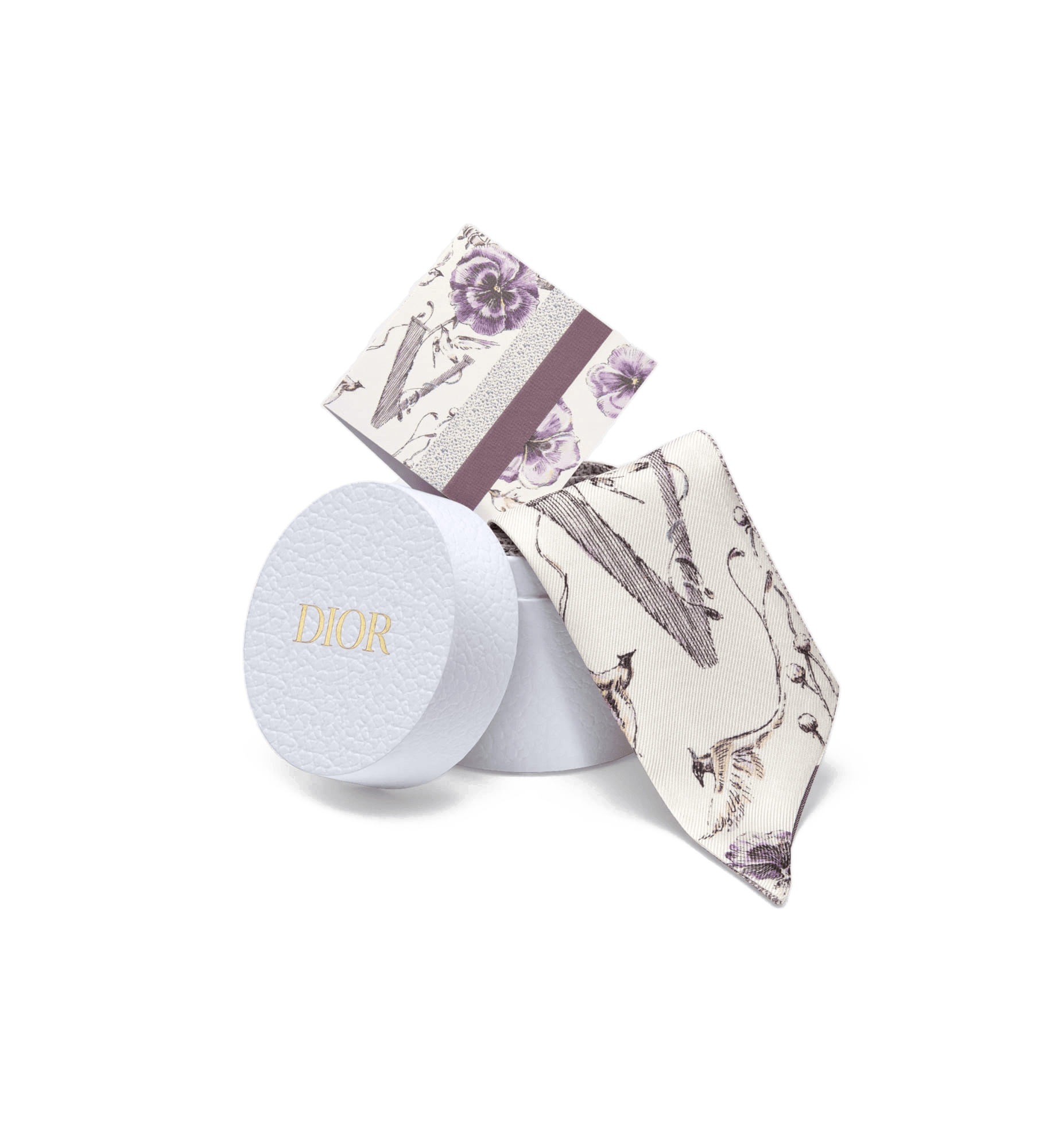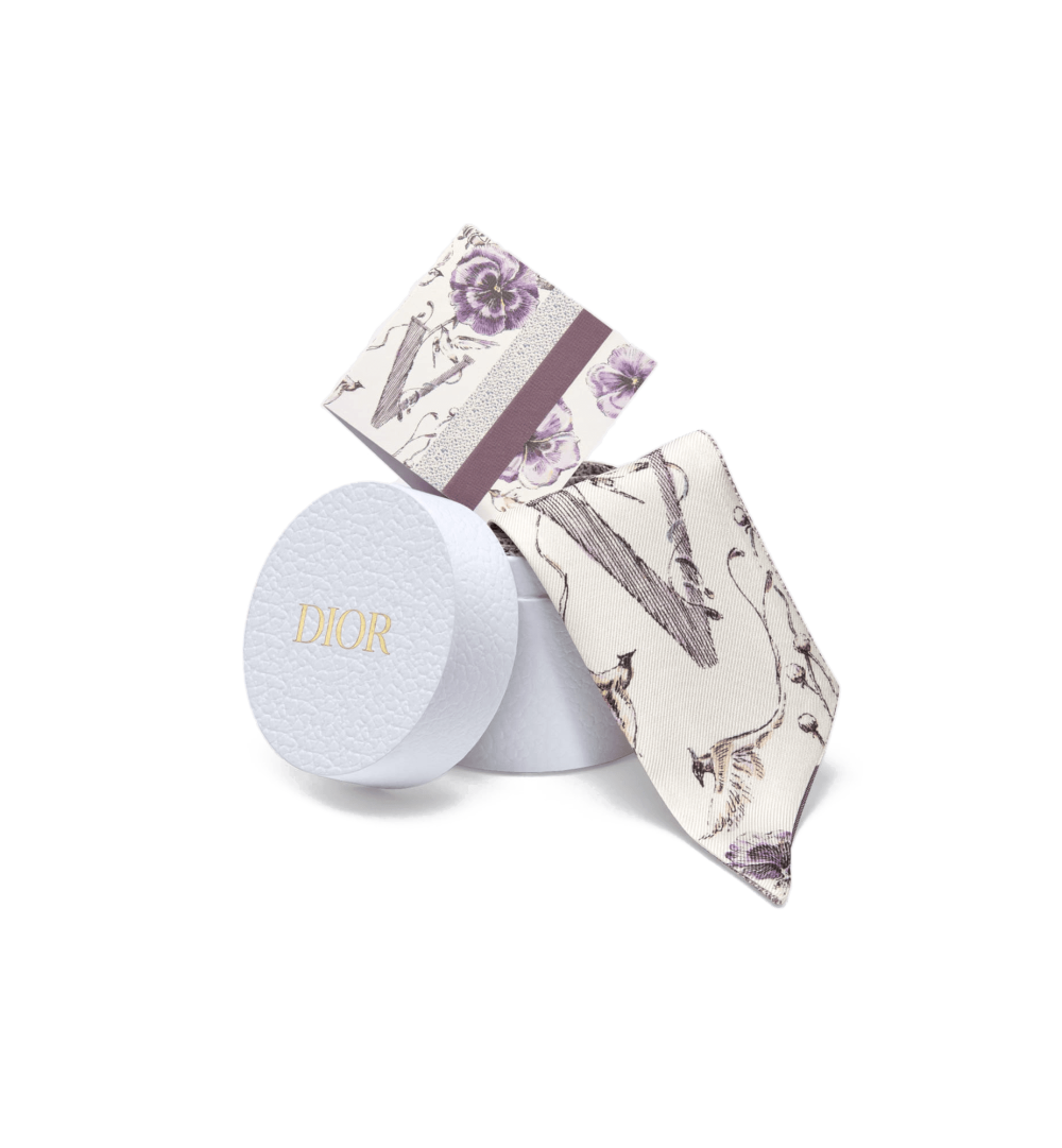 The ABCDior Mitzah scarf, crafted in silk twill, showcases one of 26 flowers that represent Christian Dior’s love of nature. A passion that flourishes like never before upon Maria Grazia Chiuri’s delicate creations in a celebration of botanical beauty. Perfume of violets in the air. The birds of paradise have left the cage that sheltered them, and by raising our eyes to the sky, we see them flying freely between the branches of tall secular trees. Enhanced by a contrasting Christian Dior signature jacquard band on the back, the ivory multicolor Mitzah scarf adds the finishing touch to any look and may be tied around the neck, at the wrist or on a bag.