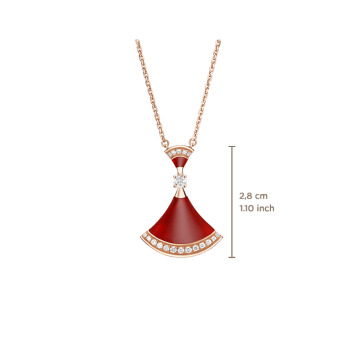 Embodying Italian elegance, the Divas’ Dream pendant necklace with chain and red carnelian inserts epitomises the legend of a diva, with her mysterious, unforgettable allure. Quintessentially feminine and refined, the pendant’s fan-shaped motif draws inspiration from the mosaics of the Roman Baths of Caracalla, reflecting Bvlgari’s integral bond with the Eternal City through a modern design and sophisticated gemstone combinations. Divas’ Dream 18 kt rose gold necklace with carnelian inserts, one round brilliant-cut diamond and pavé diamonds. 16-17 in (41-43 cm) long.