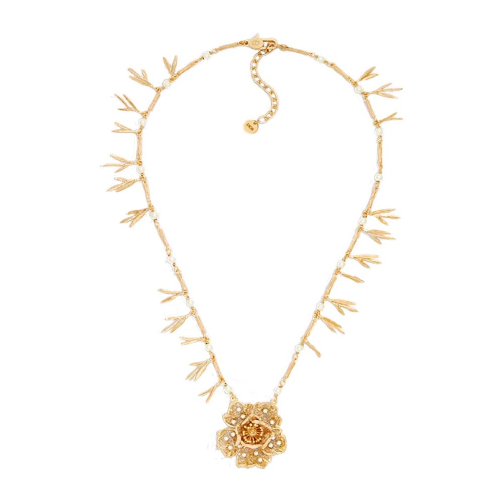 New for Fall 2025, the Jardin de Dior necklace delicately captures the collection’s refined bucolic theme. Celebrating the House’s unique savoir-faire, the gold-finish metal chain, accented by white resin pearls and bamboo detailing, features a finely carved oversized peony embellished with delicate resin pearls. The exceptional necklace can be combined with other Jardin de Dior creations.