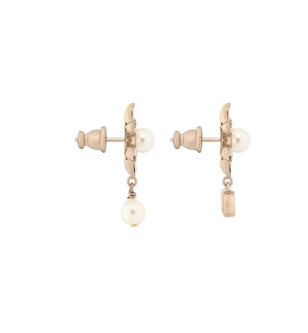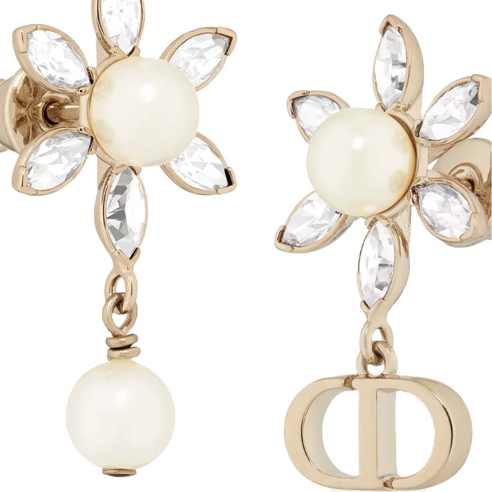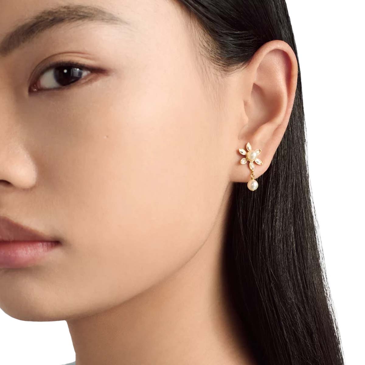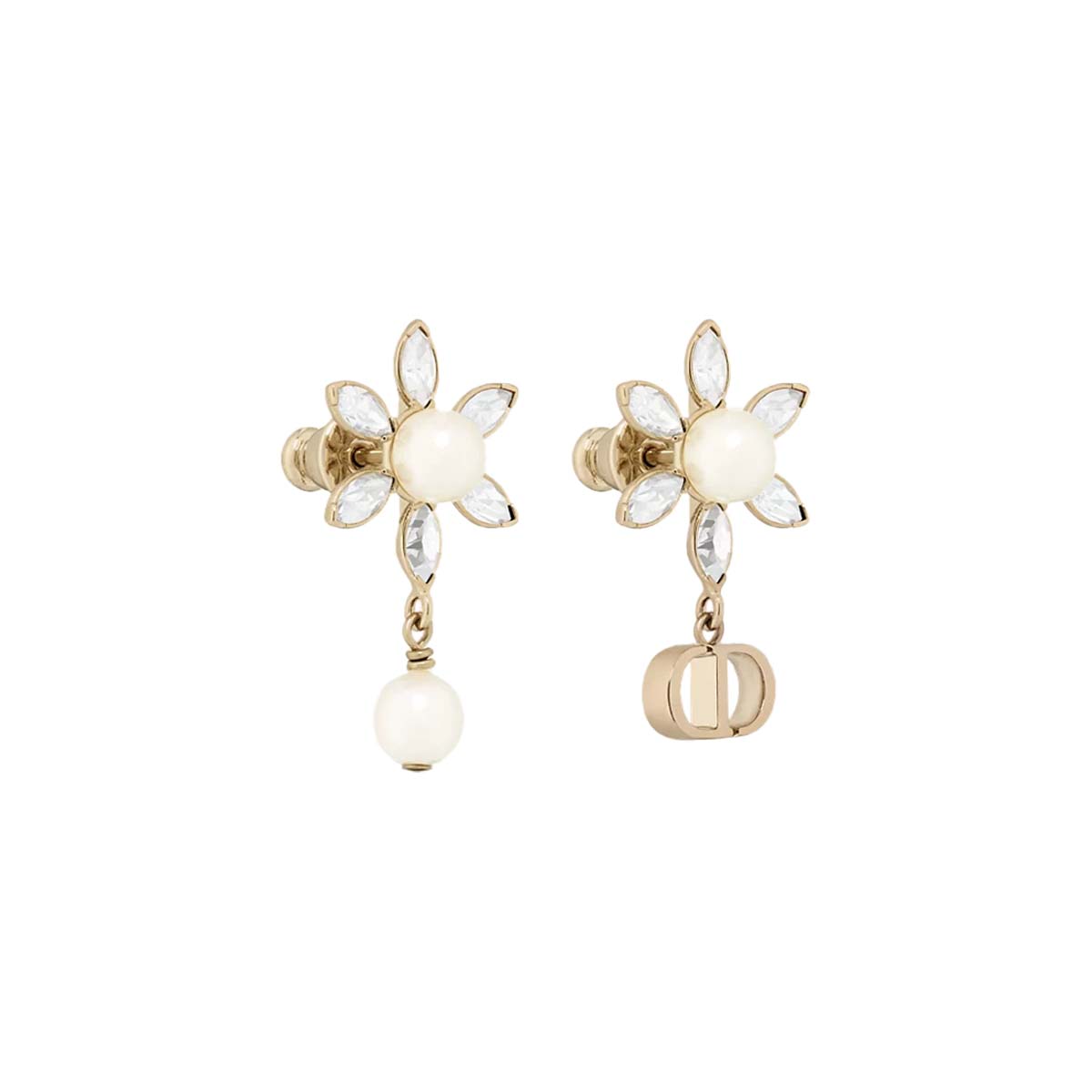 The Bloom in Dior earrings pay vibrant homage to Mr. Dior’s passion for flowers. Finely crafted in gold-finish metal, the asymmetric design features the CD signature on one side and a resin pearl on the other, both suspended from a delicate flower embellished with silver-tone marquise-cut crystals adorned with a white resin pearl at the center. The refined earrings can be combined with other Bloom in Dior creations.