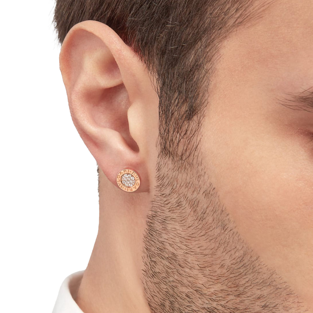 Grown from the Roman roots of the brand as an elegant fusion of culture and modernity, the Bvlgari Bvlgari combinable 18 kt rose gold circle stud earring set with round brilliant cut diamonds are an effervescent, contemporary statement of classiness. The trademark double logo was initially inspired by the curved inscriptions on ancient coins, whilst today it has evolved into playful interpretations. In tune with the collection’s dynamic spirit, the single earring can be paired with different colours and gemstones combinations, for a truly unique style. Bvlgari Bvlgari 18 kt rose gold single stud earring with pavé diamonds.