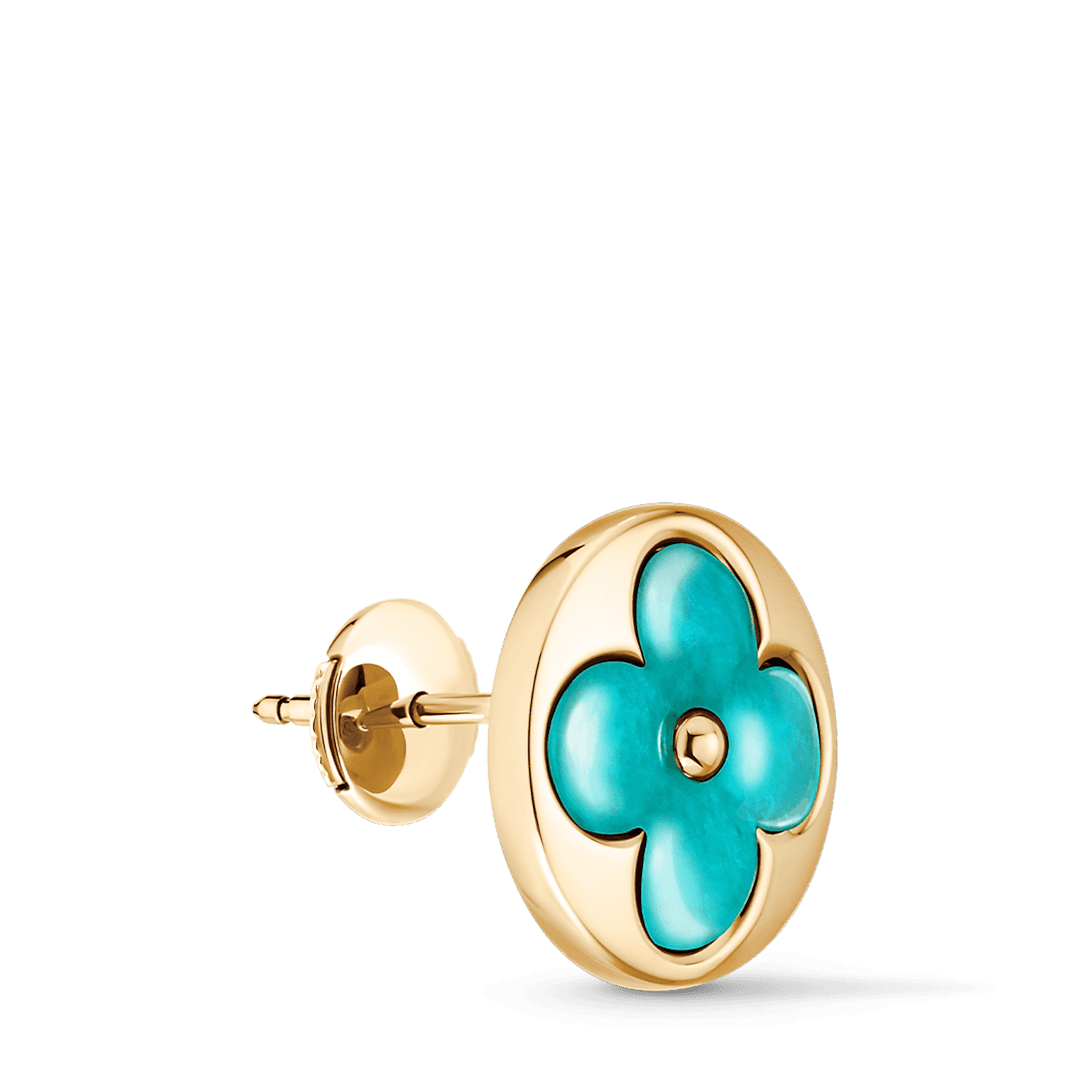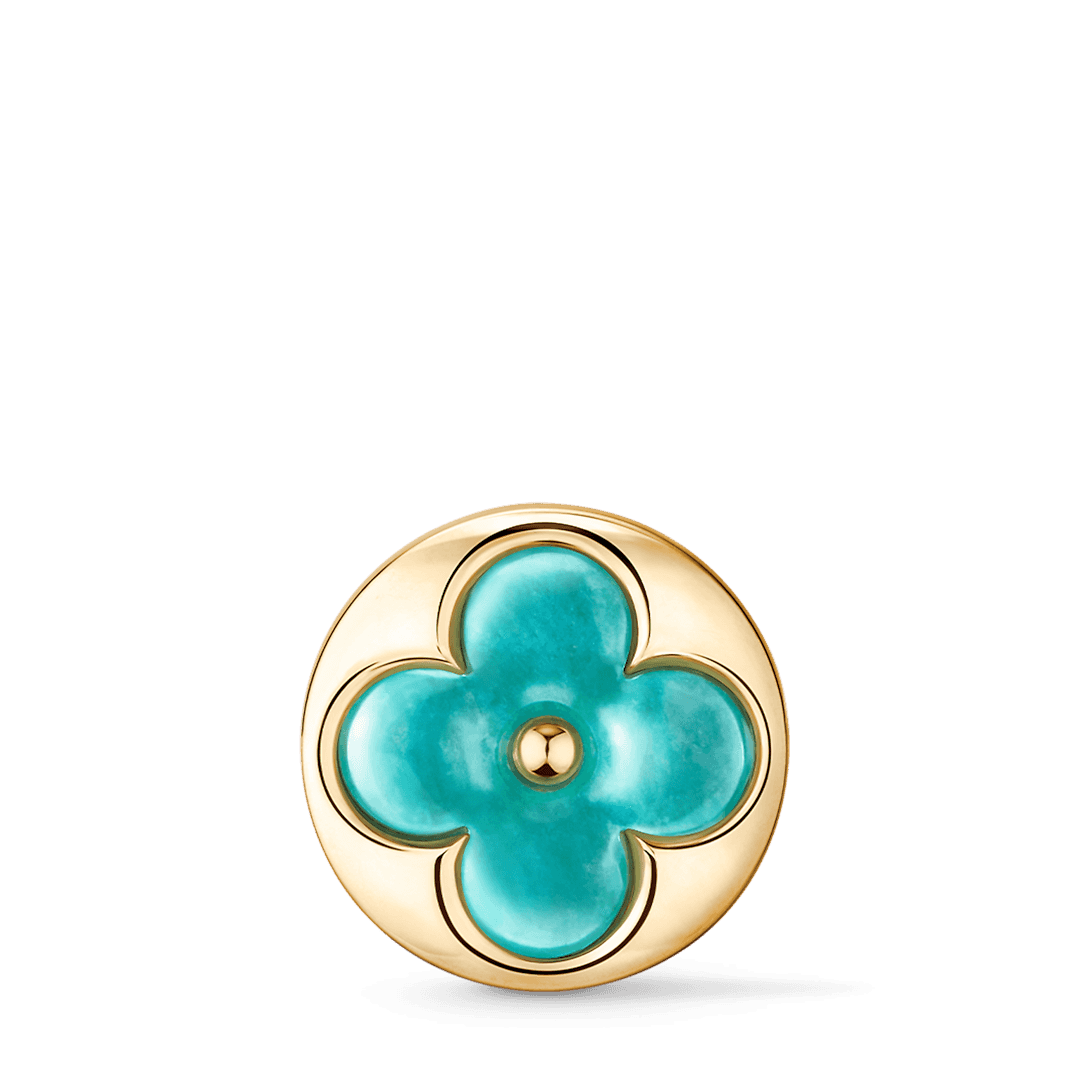 The Color Blossom pieces celebrate the emblematic Monogram Flower, designed in 1896 by Georges-Louis Vuitton, son of the founder. Set into 18-karat yellow gold, this precious ear stud features a Sun motif carved from amazonite, hand-polished to a high gloss. Months of work were necessary to perfect the stone’s subtle curves and sparkle. This delicate ear stud is an invitation to stack, mix or match with other models from the collection.