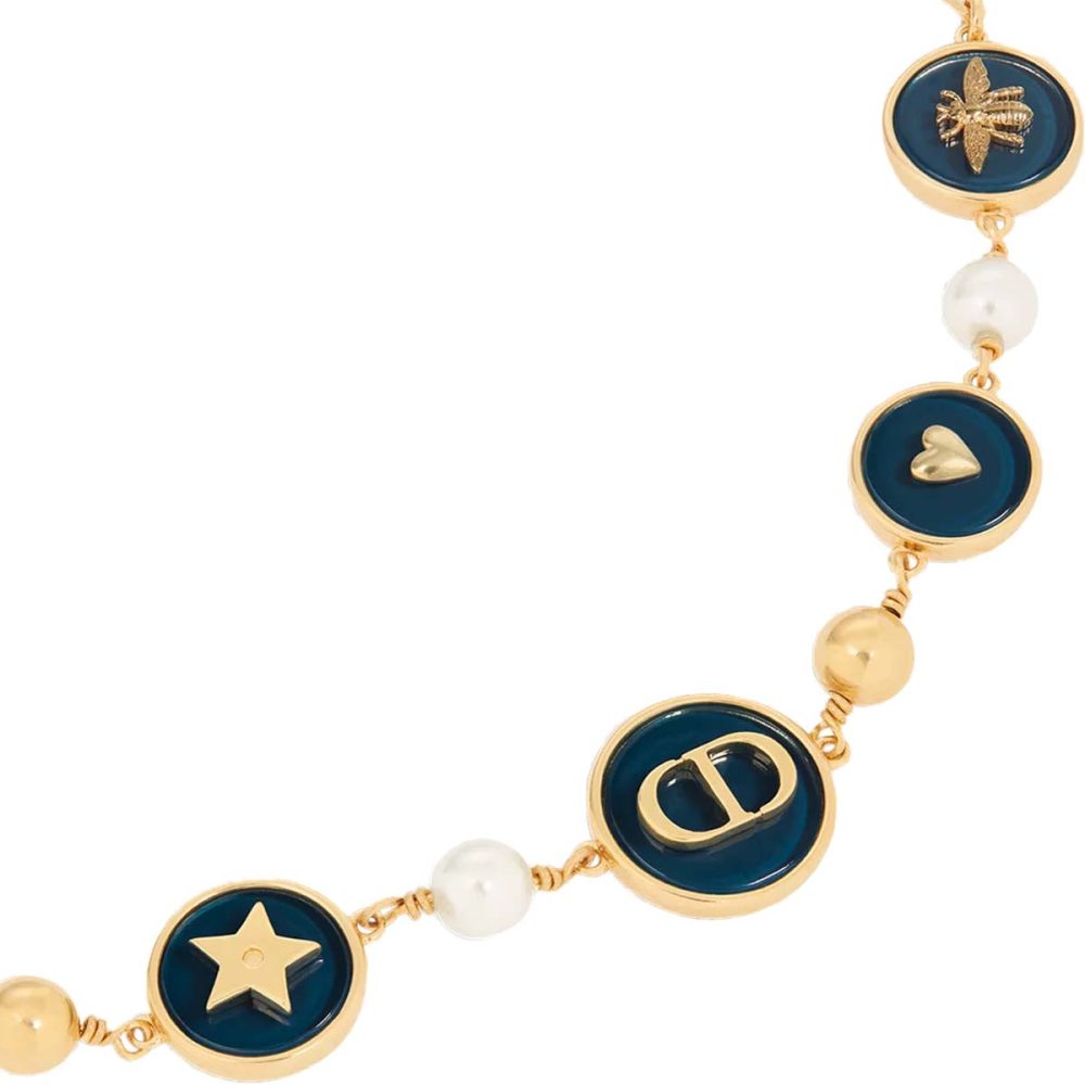 The D-Luck necklace is a modern creation steeped in symbols cherished by Mr. Dior. Finely crafted in gold-finish metal, it is accented with white resin pearls and navy blue transparent resin medallions. The medallions feature iconic details including the heart, star, clover, bee and CD signature. The necklace will add a refined touch to any look and will complement other D-Luck creations.