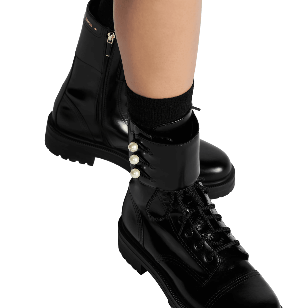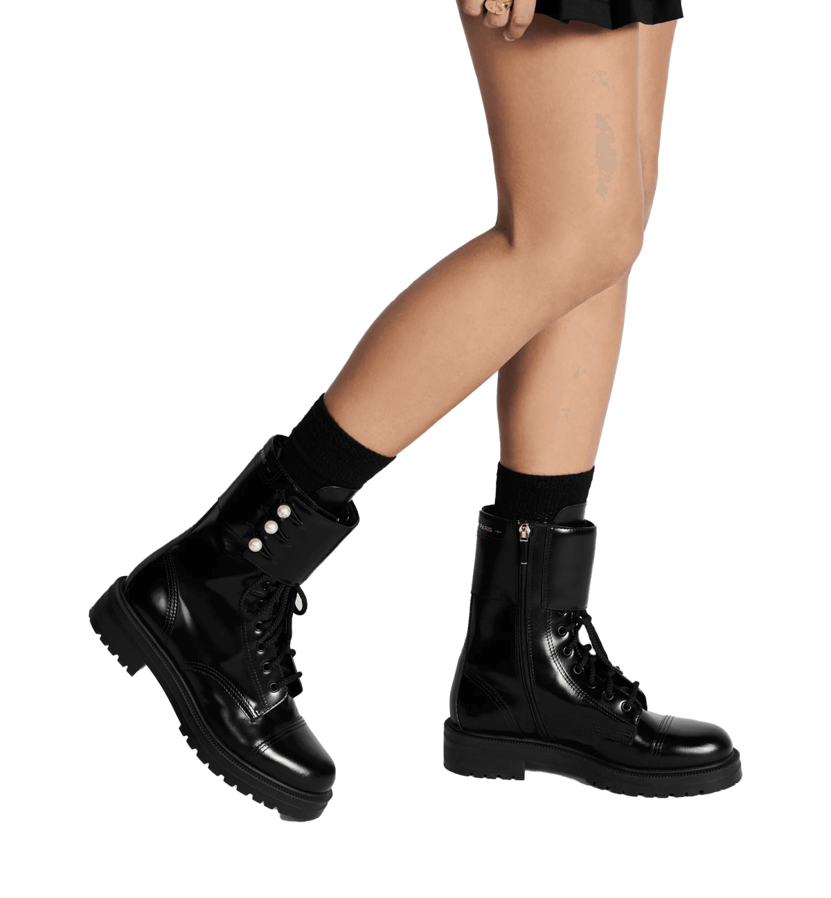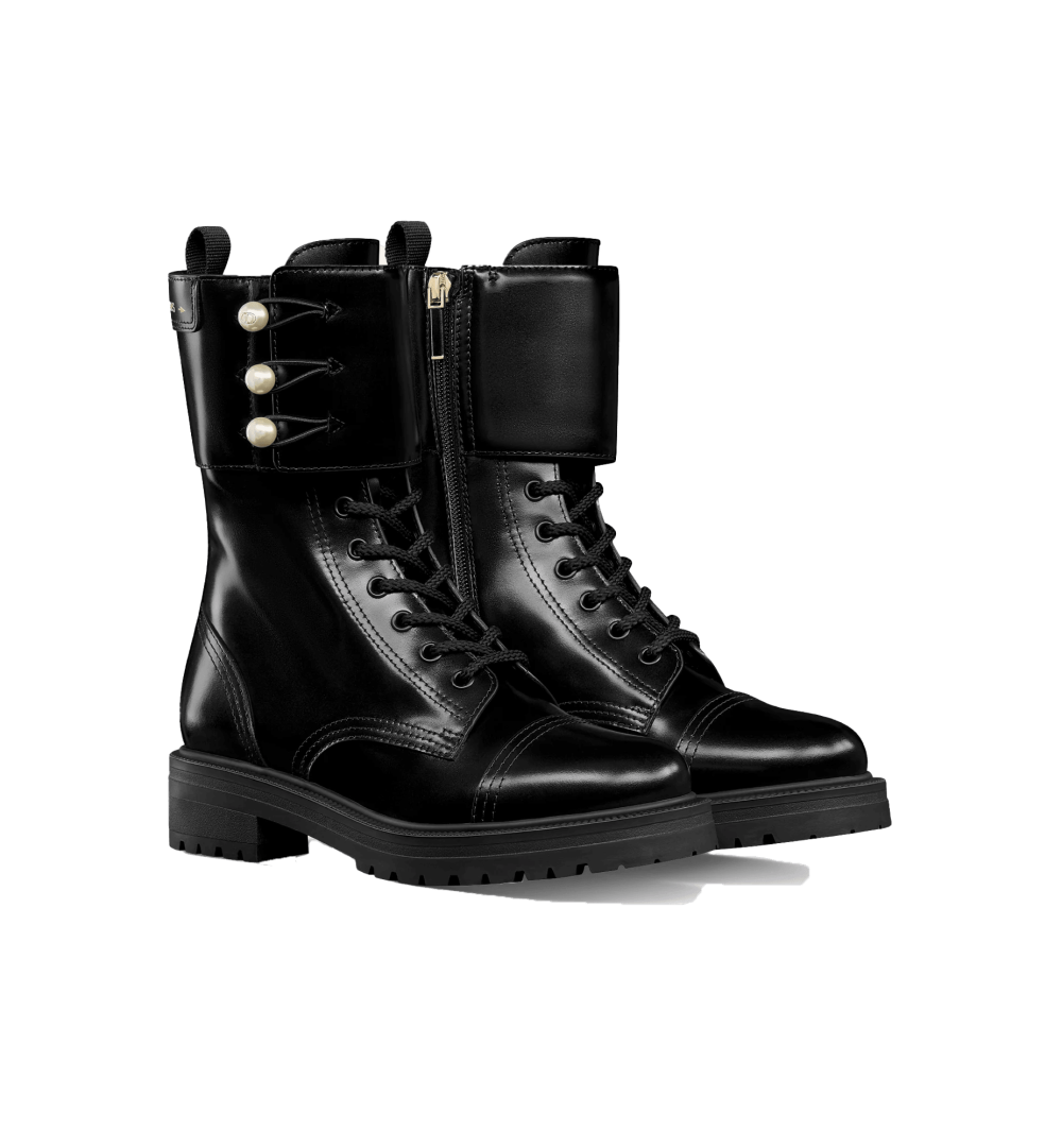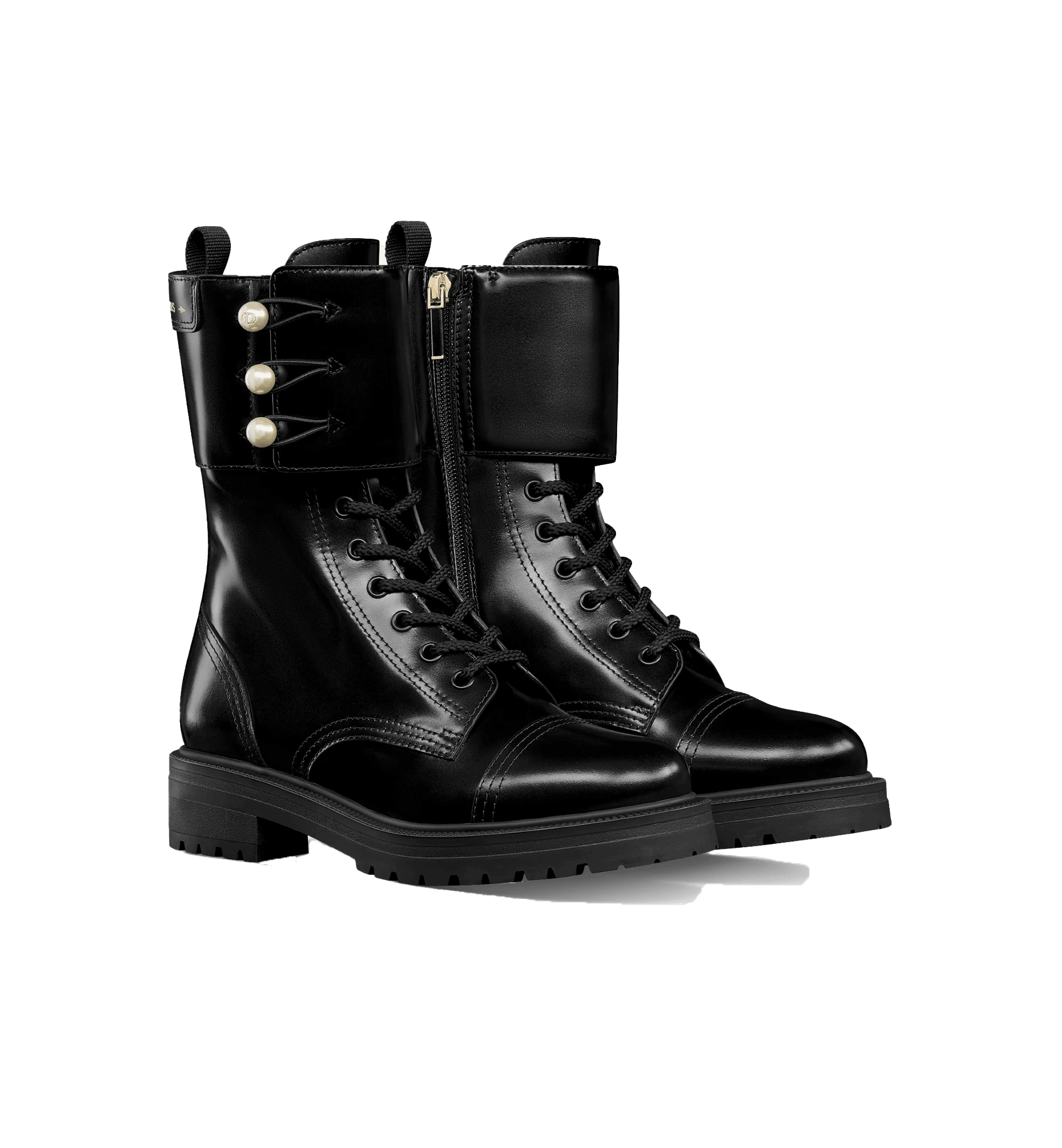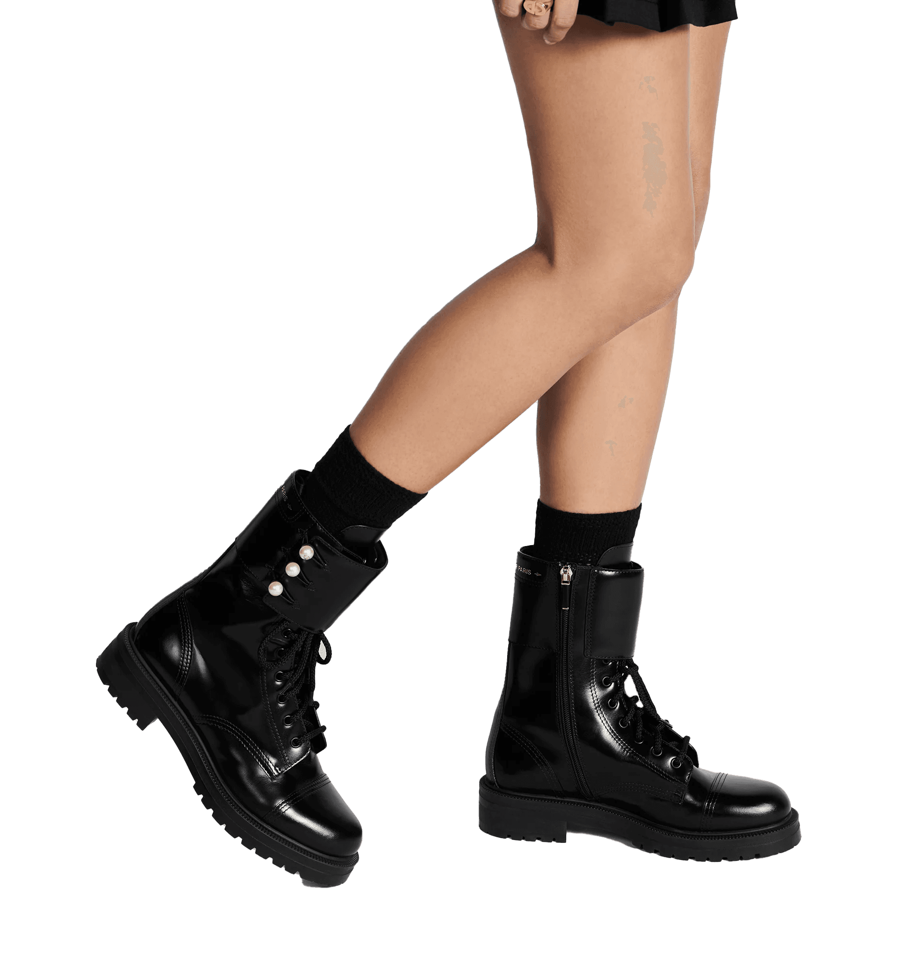 New for the Cruise 2024 collection, the D-Strike ankle boot adds couture details to a bold silhouette. Presented in black matte calfskin, the style stands out with a wide band adorned with functional white resin pearls, inspired by the iconic Dior Tribales earrings. A gold-tone CD signature on the top resin pearl and rear Christian Dior Paris signature as well as an ultra-lightweight EVA sole complete the modern ankle boot.