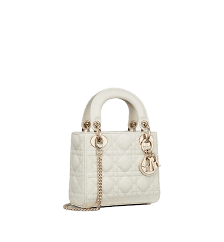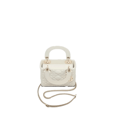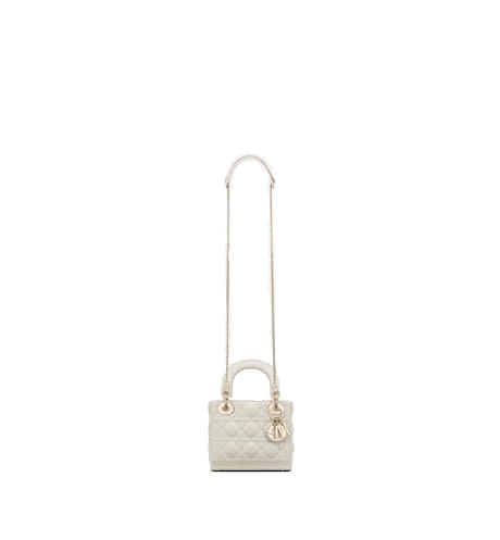 The Lady Dior bag epitomizes Dior’s vision of elegance and beauty. Sleek and refined, the creation is timeless. Crafted in latte Cannage calfskin, the bag showcases a graphic interpretation of the House’s iconic motif. The tonal matte metal D.I.O.R. charms offer elegant allure. Featuring a removable chain shoulder strap, the miniature Lady Dior bag can be carried by hand or worn crossbody.