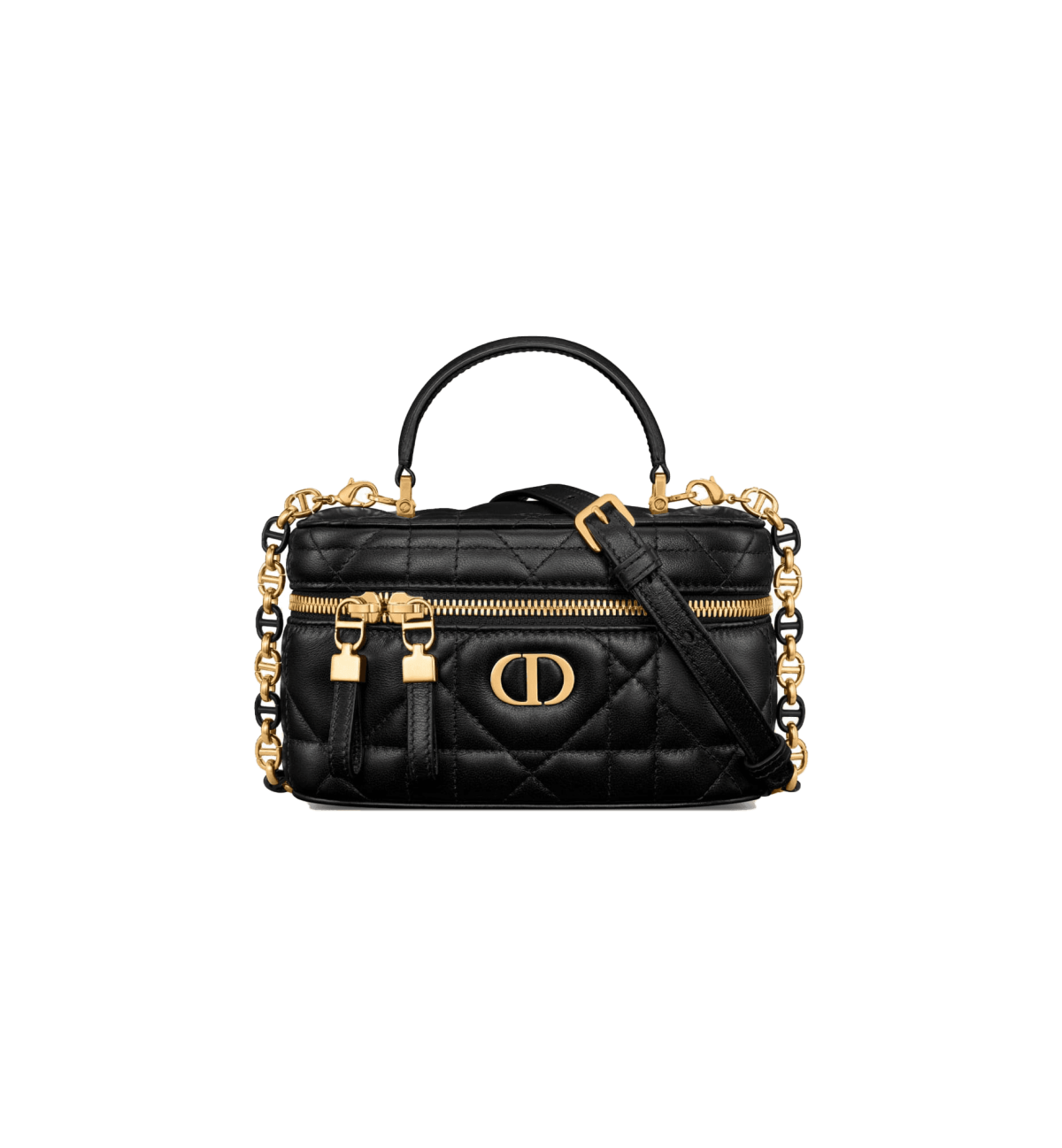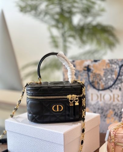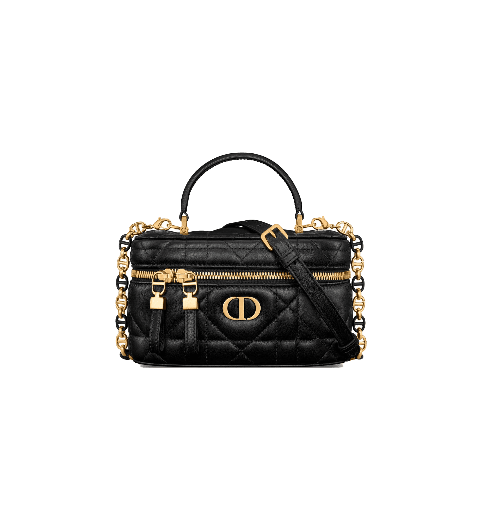 New for Summer 2024, the Dior Caro mini vanity case enhances the line with a compact design that is both functional and refined. Crafted in powder pink lambskin, it stands out with the original quilted effect of the Macrocannage stitching, as well as a CD signature on the front. The vanity case will accommodate the essentials and is completed by a pocket and interior mirror. It can be carried by hand using the handle or worn over the shoulder or crossbody using the adjustable and removable chain strap with alternating links in gold-finish metal and powder pink enamel with a leather insert.