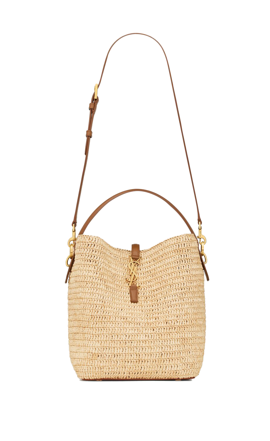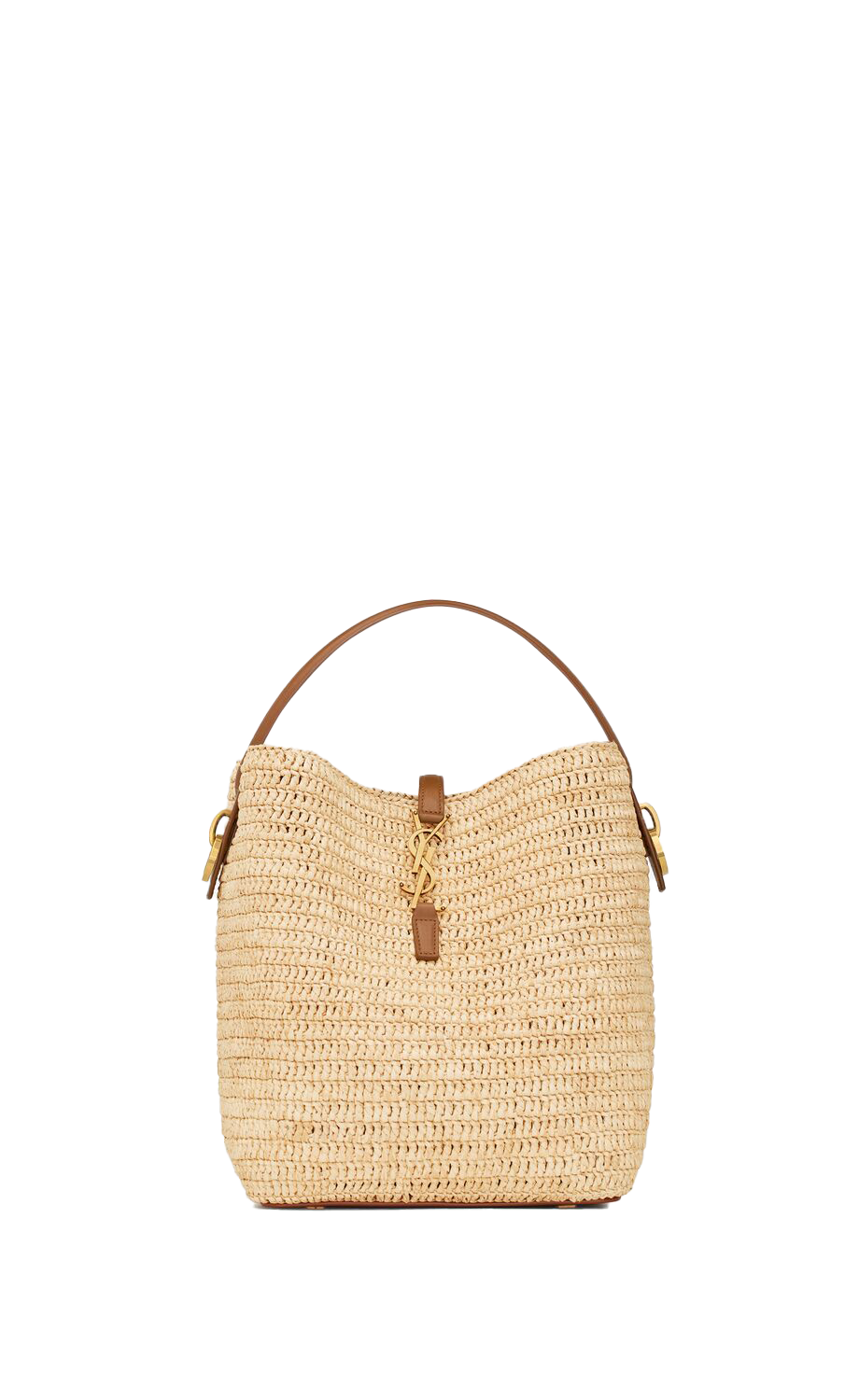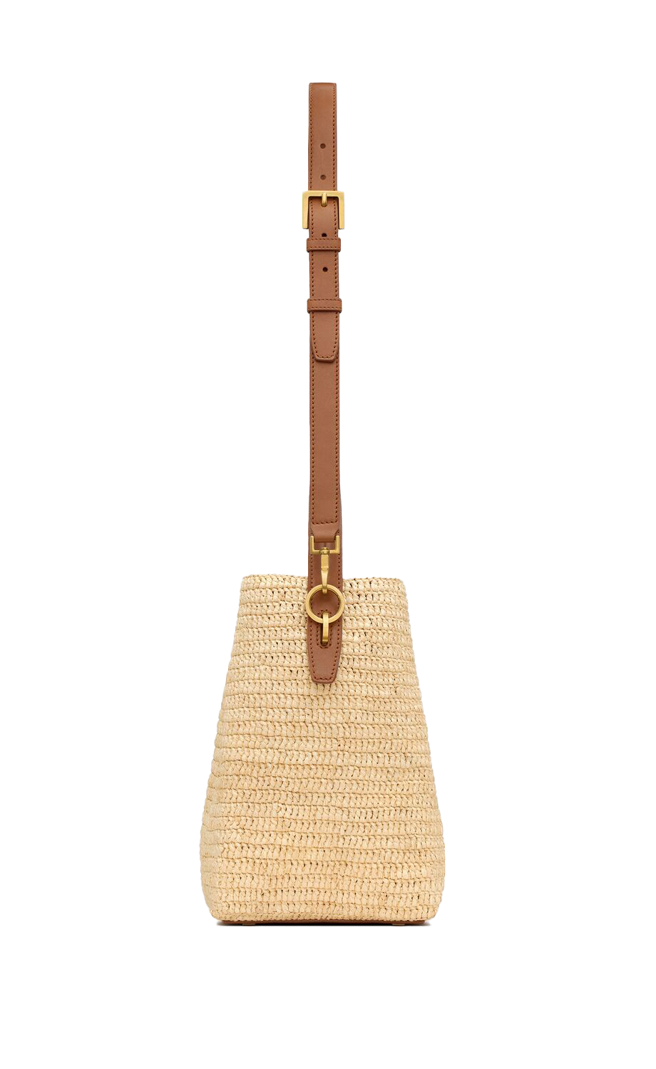 BUCKET BAG FEATURING A CASSANDRE HOOK CLOSURE, MADE WITH NATURAL WOVEN RAFFIA AND VEGETABLE-TANNED LEATHER.
