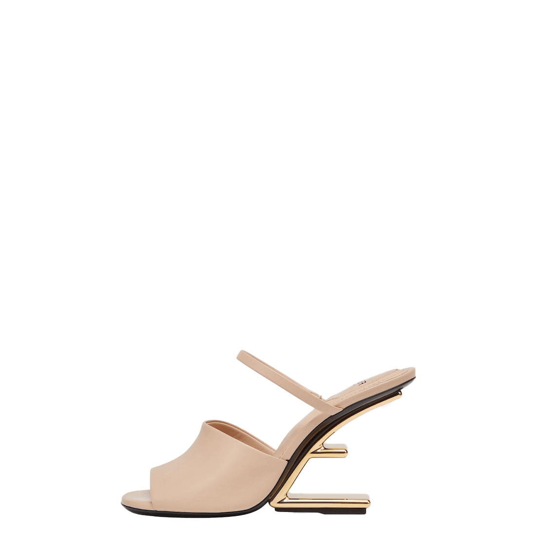 Fendi First sandals with wide band and strap. Made of black leather. Diagonal F-shaped sculpted heel in gold-colored metal.