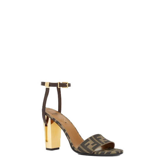 Delfina round toe sandals with ankle strap. FF jacquard fabric material. Brown leather details. Cut-out detailing and gold-tone metallic FF pattern accent the heel.