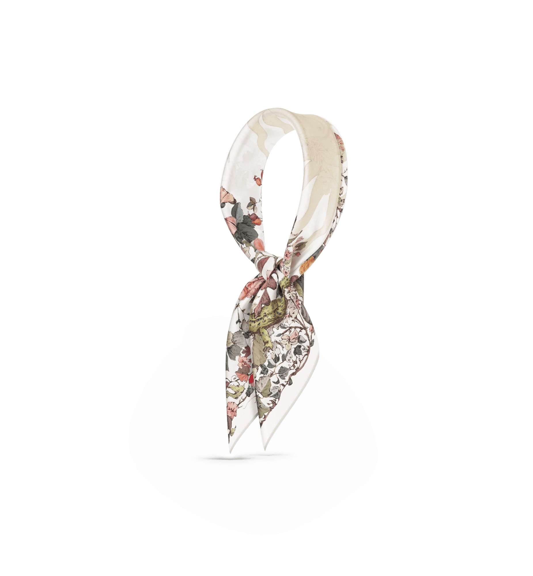 The square scarf showcases the Dior 4 Saisons Automne Soleil print by Pietro Ruffo, celebrating the season’s signature sun theme with a bucolic autumnal design punctuated by the words, L’automne peint des instants éphémères. Crafted in ecru multicolor silk twill, the double-sided style is embellished with contrasting hand-rolled edges and the Christian Dior signature. The square scarf can be tied at the neck or head to complete the Dior look.