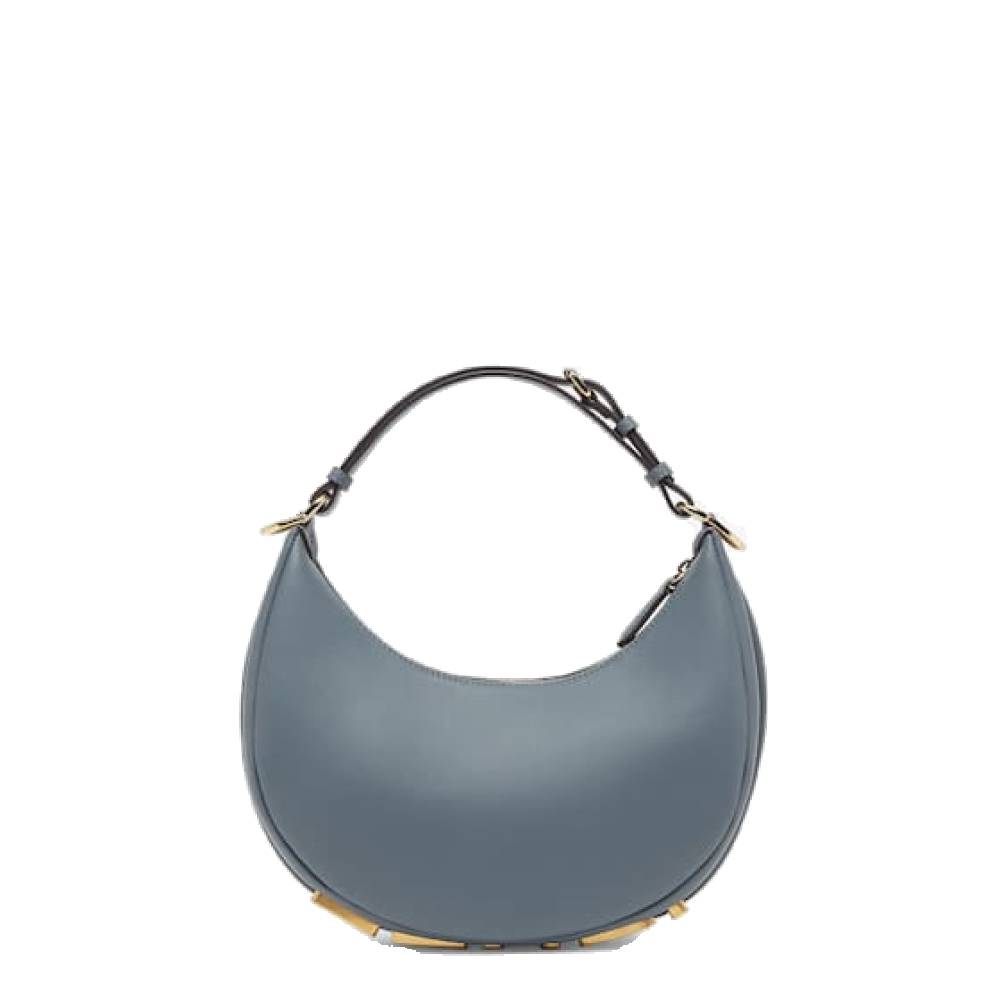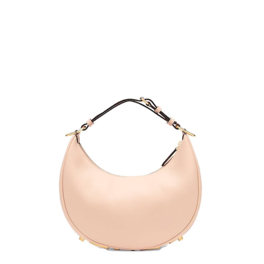 Small hobo bag made of soft white leather, with vintage gold metal FENDI lettering visible when the bag is worn under the arm.
