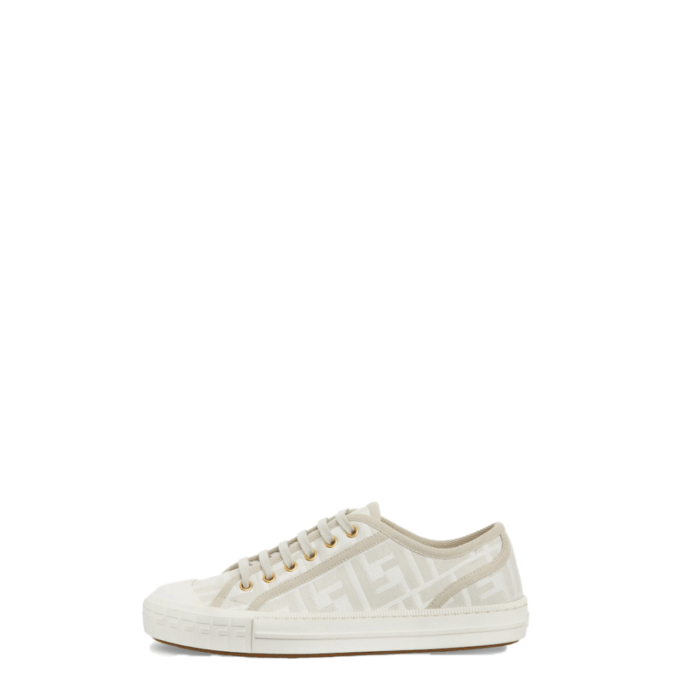 Domino sneakers with rubber cupsoles. Made of jacquard fabric with FF motif in ivory white. Trimmed with tone on tone grosgrain ribbon. The white sole with contrasting bottom features a combination of embossed textures, the FF pattern superimposed on the toe and the Fendi Roma logo on the heel. Extra white laces.