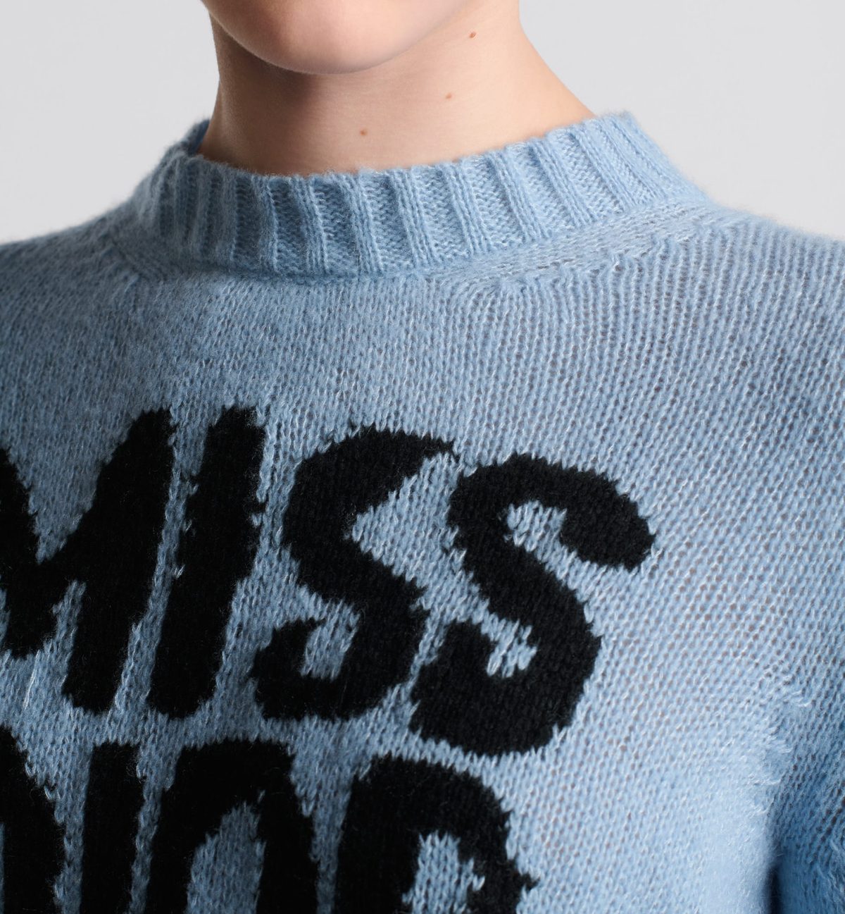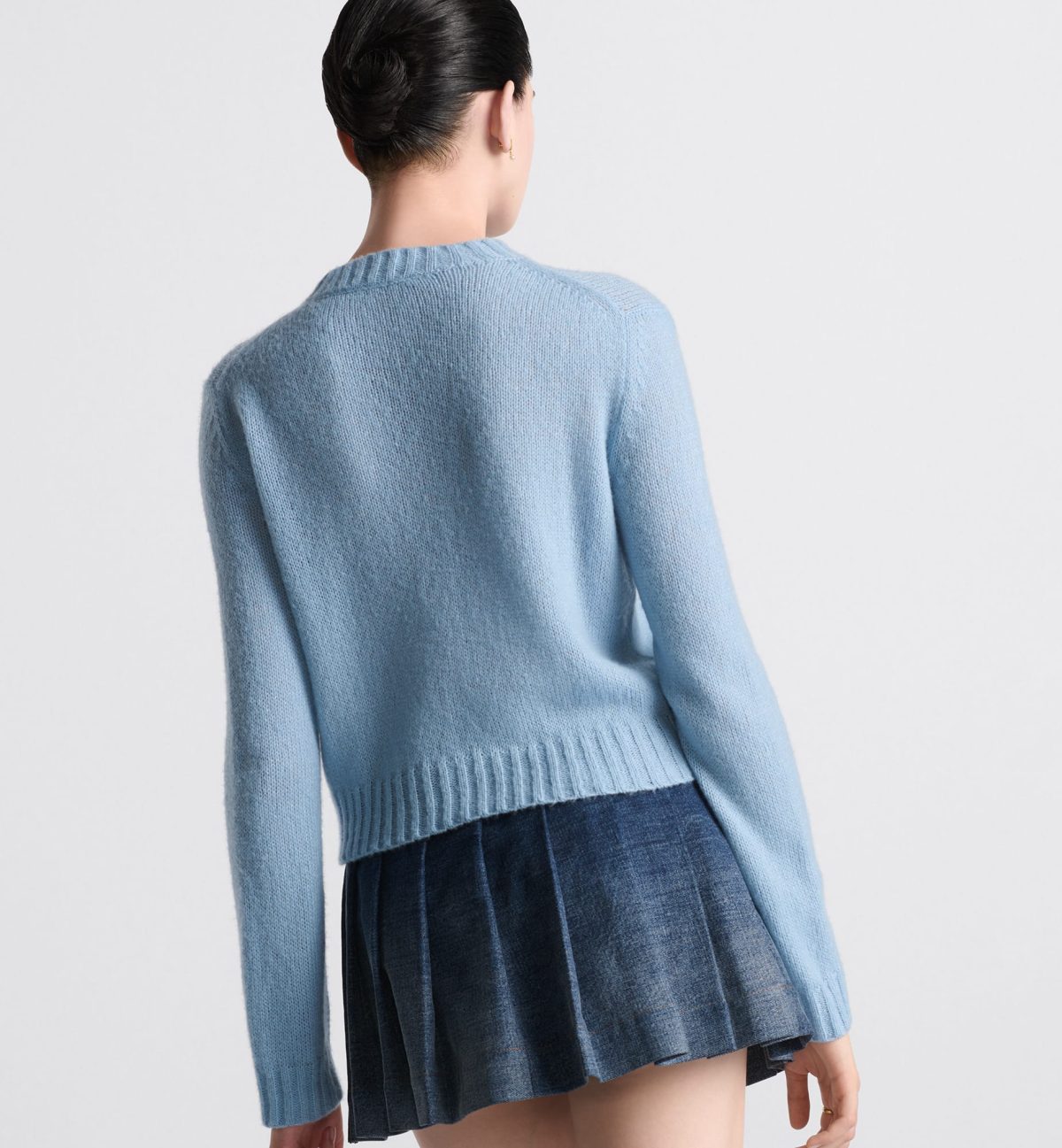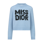 The sweater features the black Miss Dior Graffiti motif, a nod to the 1967 debut ready-to-wear collection and a manifesto to Maria Grazia Chiuri’s signature celebration of feminism. Crafted in a pale blue cashmere and silk knit, it has a ribbed hem and cuffs. The round-neck sweater can be worn with casual outfits in any season and will coordinate well with other Miss Dior Graffiti creations.