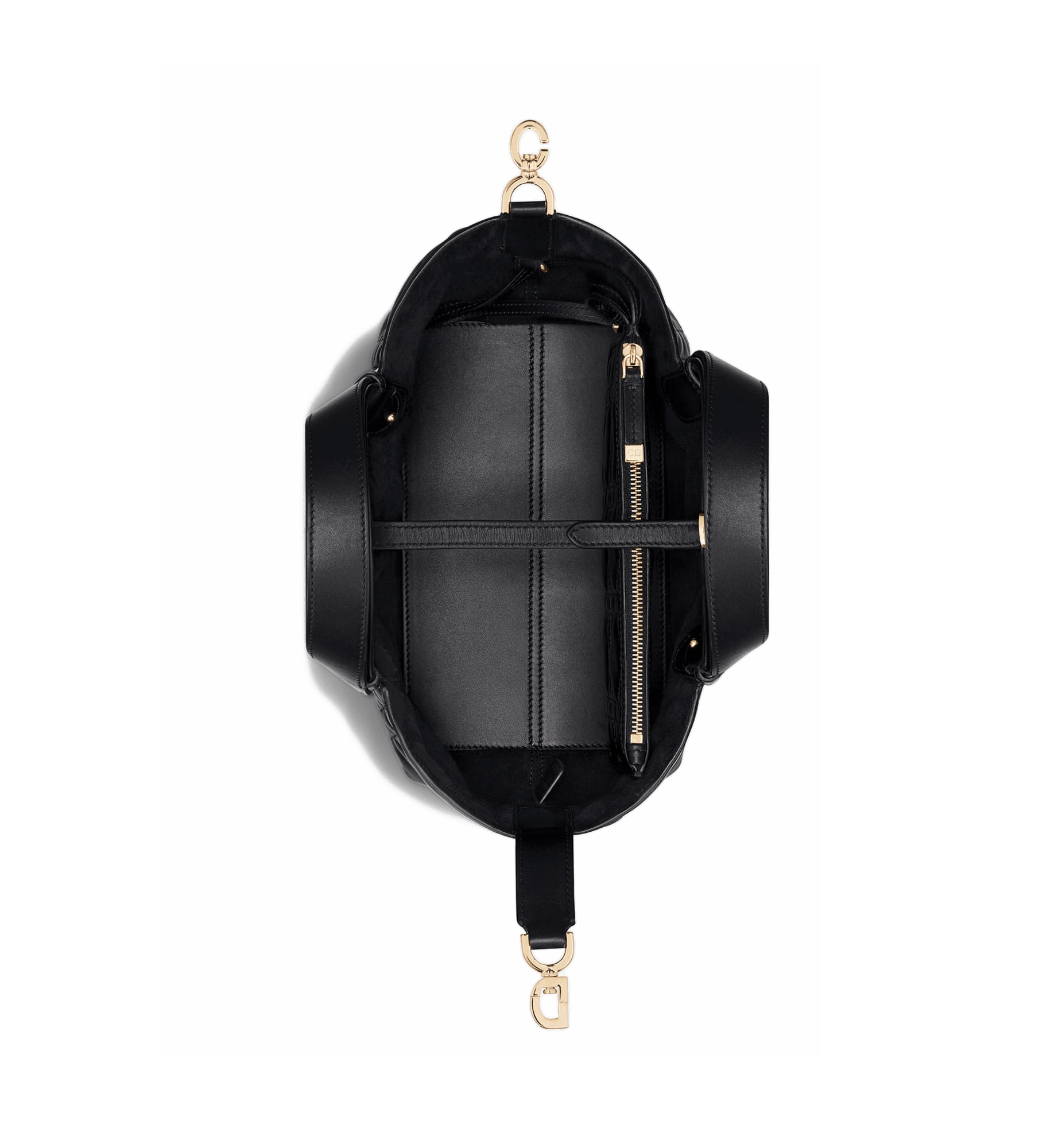 Unveiled at the Spring-Summer 2023 fashion show, the Dior Toujours bag is distinguished by a casual and practical design. Crafted in black calfskin with Macrocannage topstitching, it showcases a spacious interior compartment with a matching pouch to organize essentials. Its leather strap closure keeps items secure while the D of the CD Lock closure twists to adjust the sides and enhance the bag’s silhouette. Equipped with leather handles that can be adjusted using the small notches, the small bag can be effortlessly carried by hand.