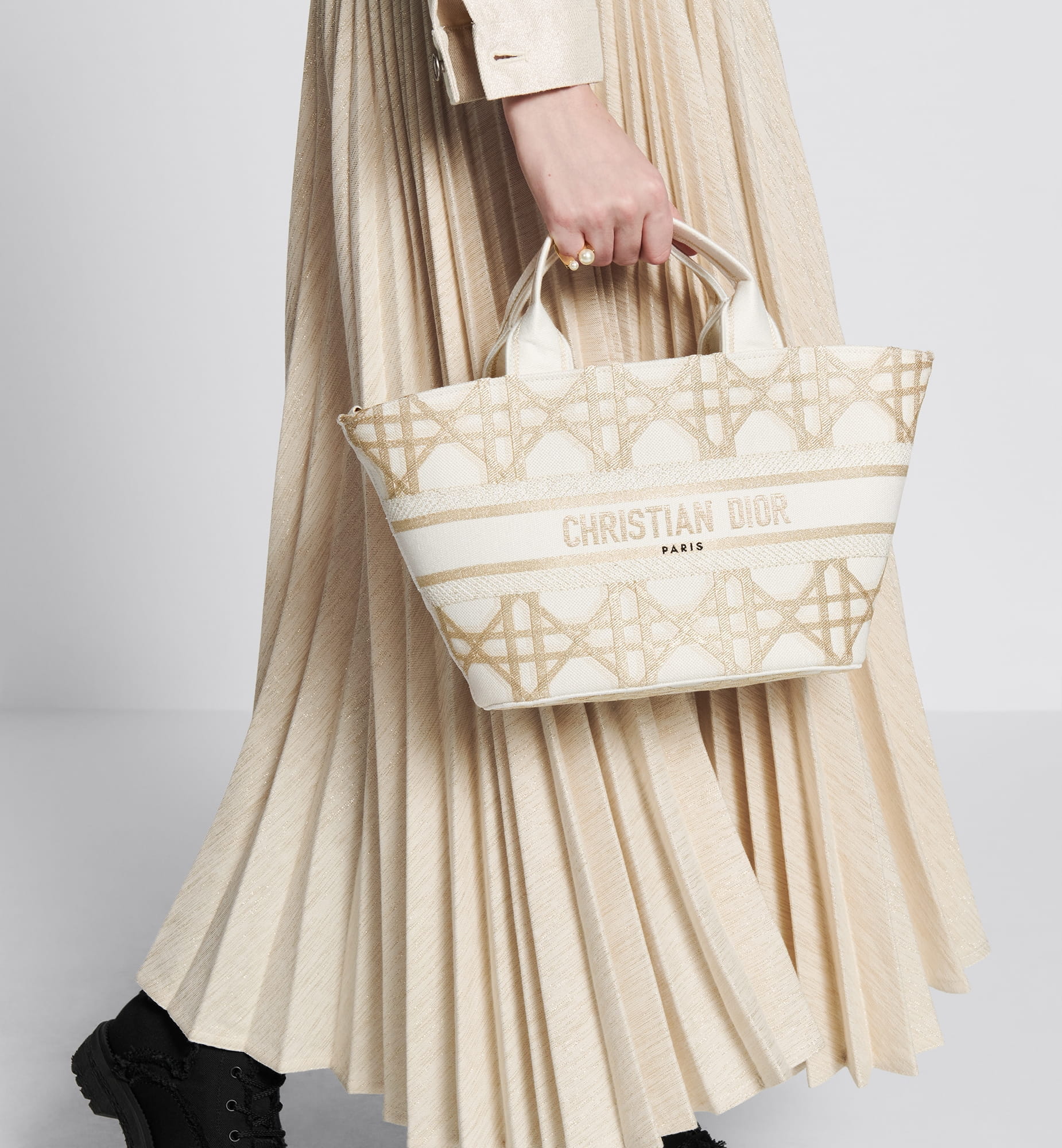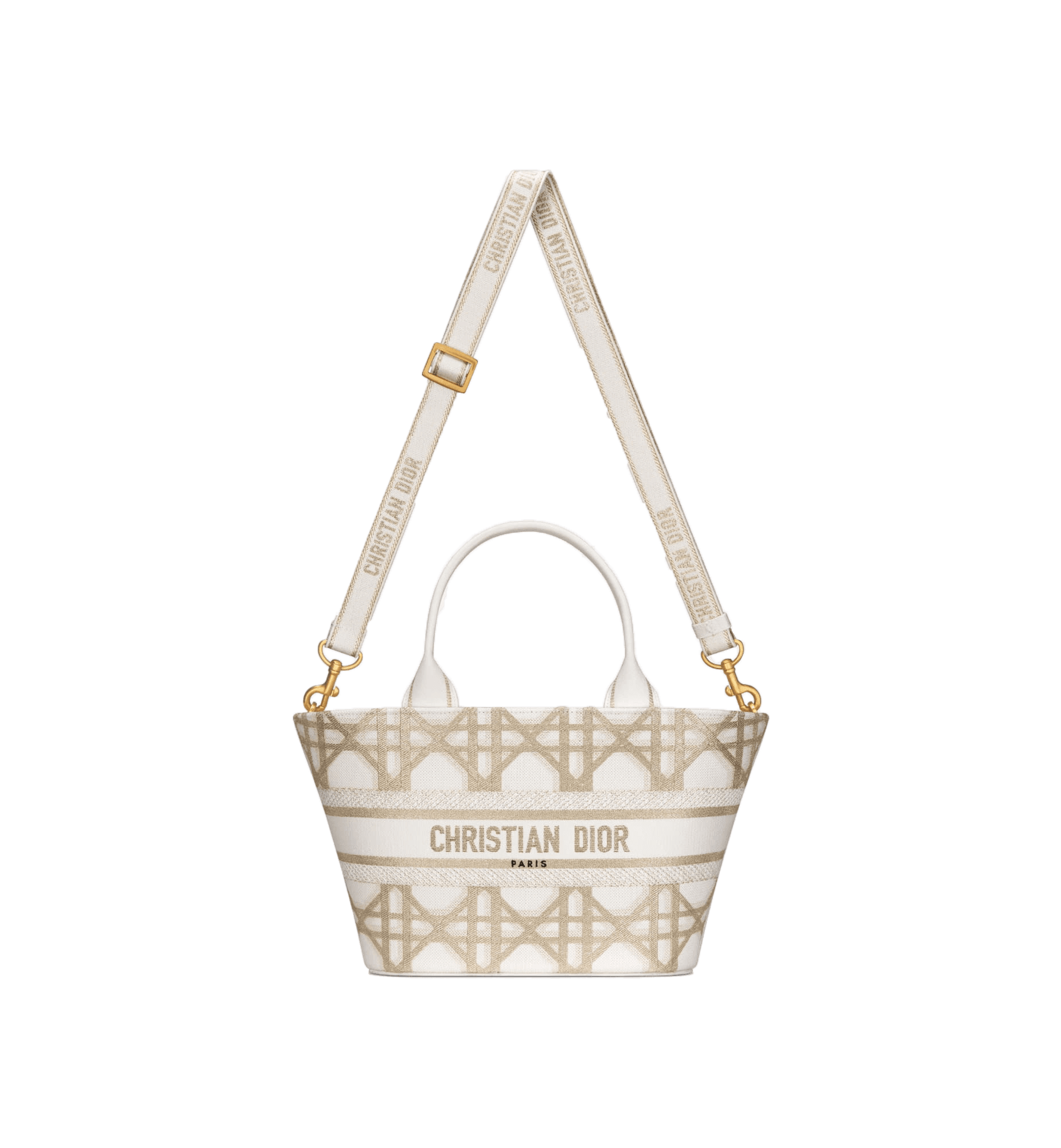 The hat basket bag stands out with its elegant silhouette combining functionality and refinement. Fully embroidered with a gold-tone Macrocannage motif, the style is enhanced by the Christian Dior Paris signature on the front. Equipped with a tonal detachable zip pouch, the spacious bag is completed by an adjustable and removable embroidered strap, allowing it to be carried by hand, worn over the shoulder or crossbody.