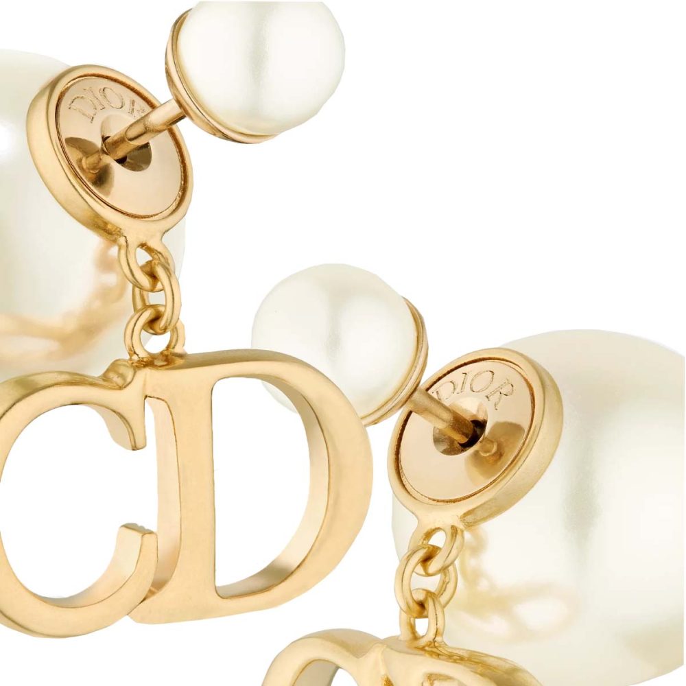 The Dior Tribales earrings play with the timeless signature of the Saddle bag, a true House icon. The hallmark resin pearls showcase the CD signature in gold-finish metal. The earrings can be combined with other Saddle creations.