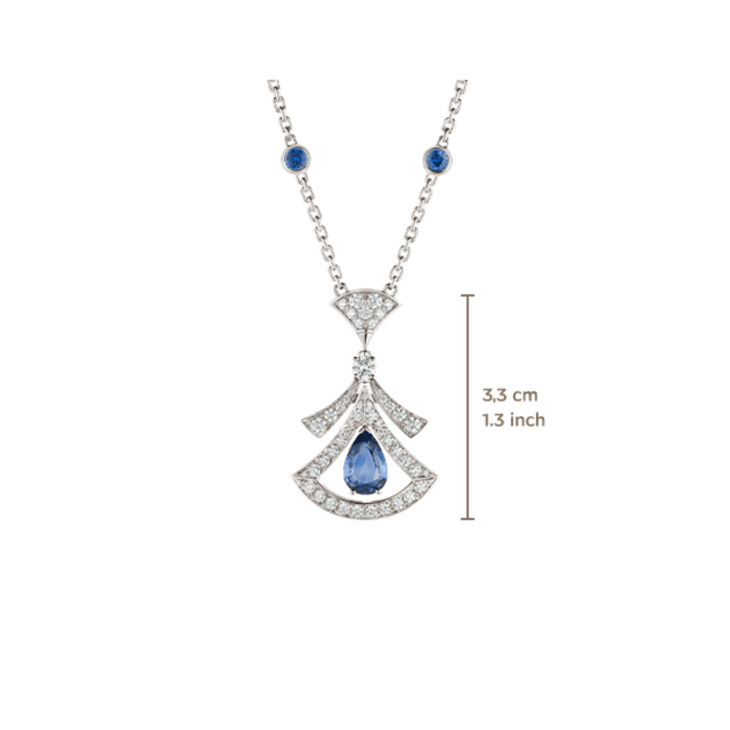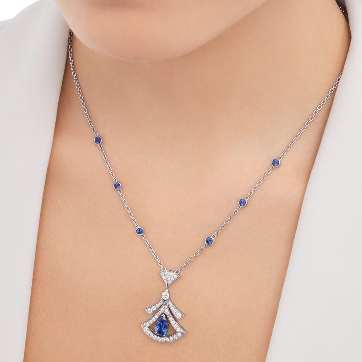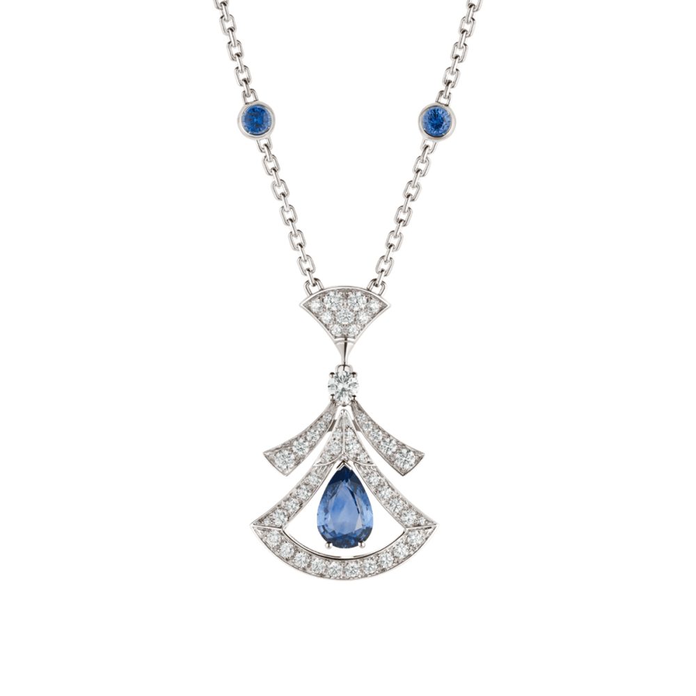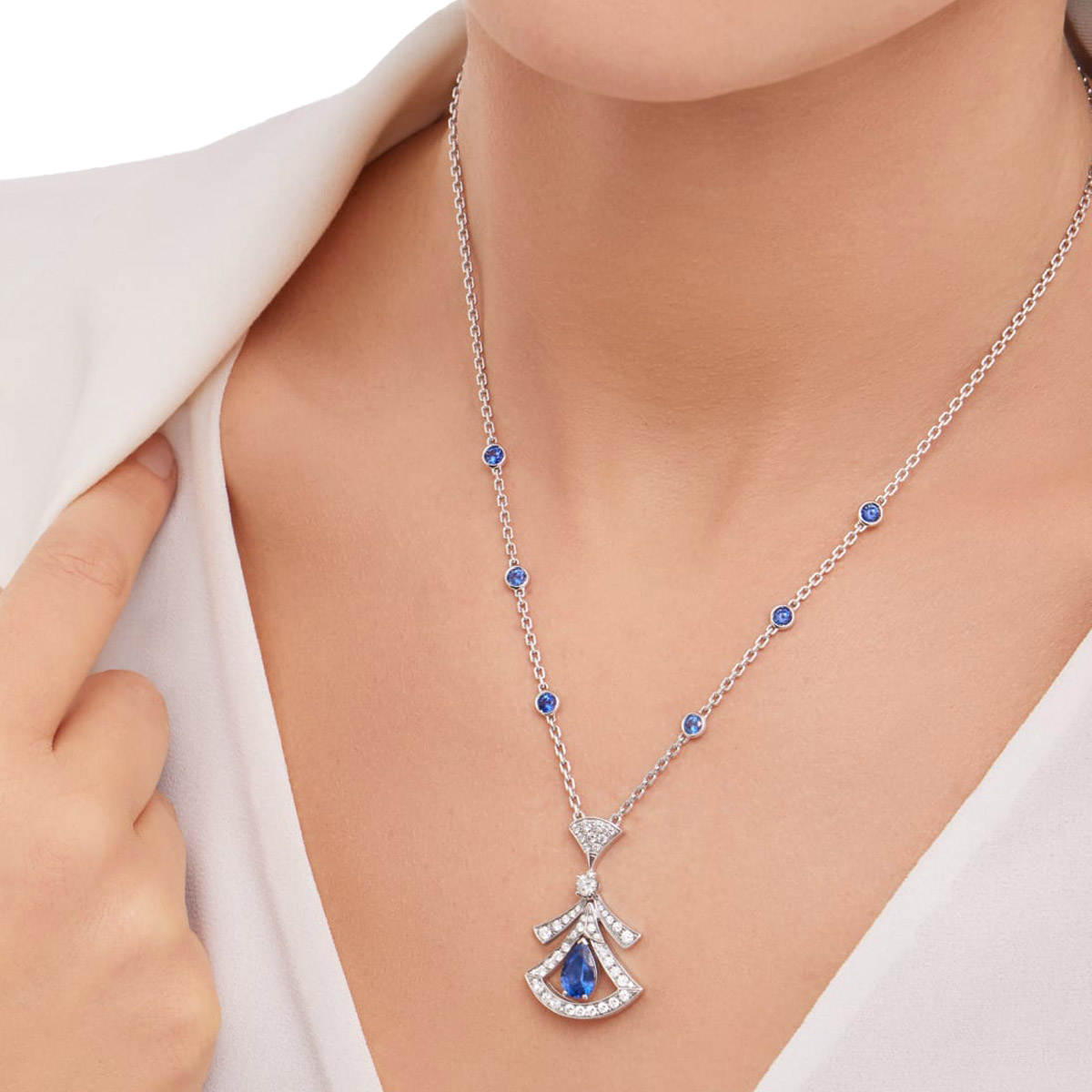 Embodying Italian elegance, the Divas’ Dream necklace epitomises the legacy of a diva, with her mysterious, unforgettable allure. Quintessentially feminine and refined, the fan-shaped motif draws inspiration from the colourful mosaics of the Roman Baths of Caracalla, reflecting Bvlgari’s integral bond with the Eternal City through the very essence of Italian beauty. In a play between full and empty displayed in its openwork design, the signature shape of the collection is reinterpreted with a light and delicate touch. Divas’ Dream 18 kt white gold openwork necklace with one pear-shaped sapphire, round brilliant-cut sapphires, one round brilliant-cut diamond and pavé diamonds.