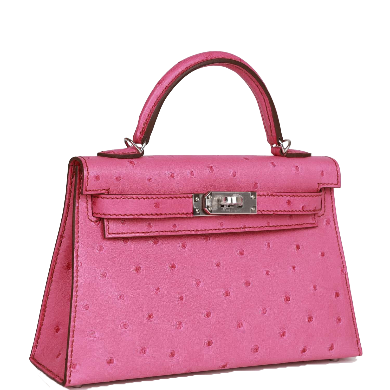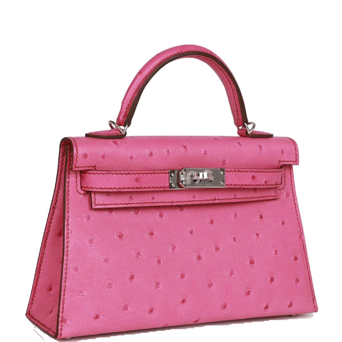 This tiny Kelly, in the Sellier style, is in Fuchsia ostrich leather with palladium hardware and has tonal stitching, two front straps with front toggle closure, single rolled handle and removable shoulder strap.