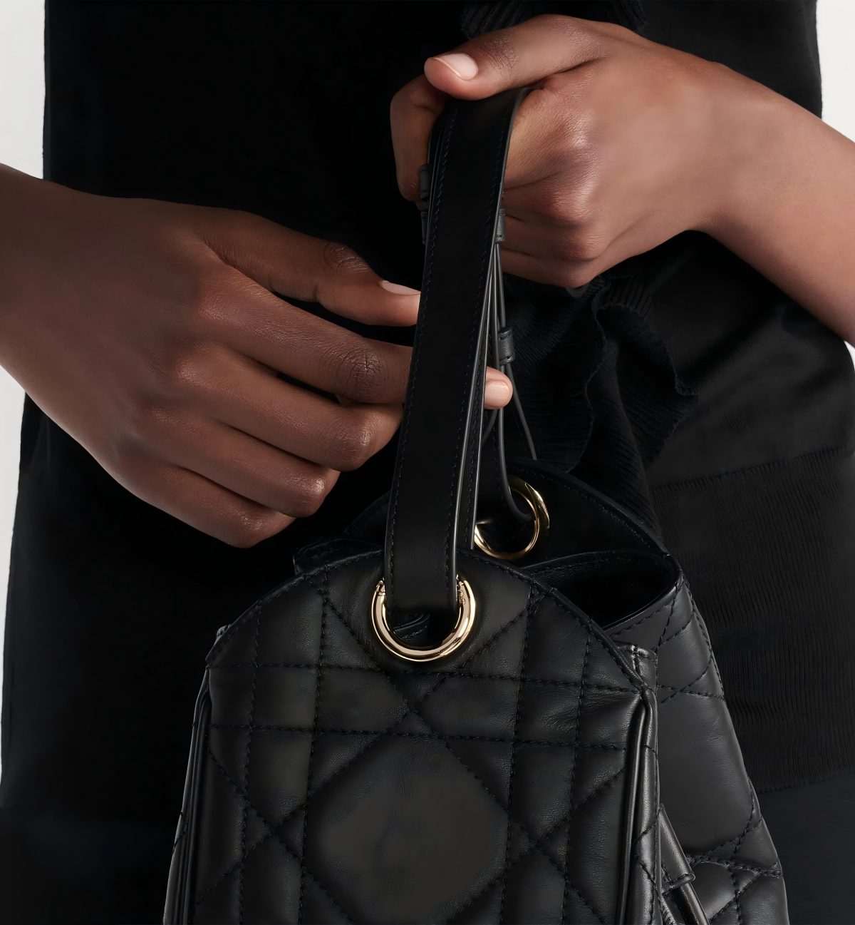 New for Winter 2025, the D-Motion bag is distinguished by a modern and practical bucket design. Crafted in black lambskin with Macrocannage stitching, the supple style features a drawstring closure that opens to reveal a spacious interior compartment with a zip pocket for all the essentials. Adorned with pale gold-finish metal D.I.O.R. charms, the medium bag has an adjustable strap with a sliding design, allowing it to be worn on the shoulder or crossbody.