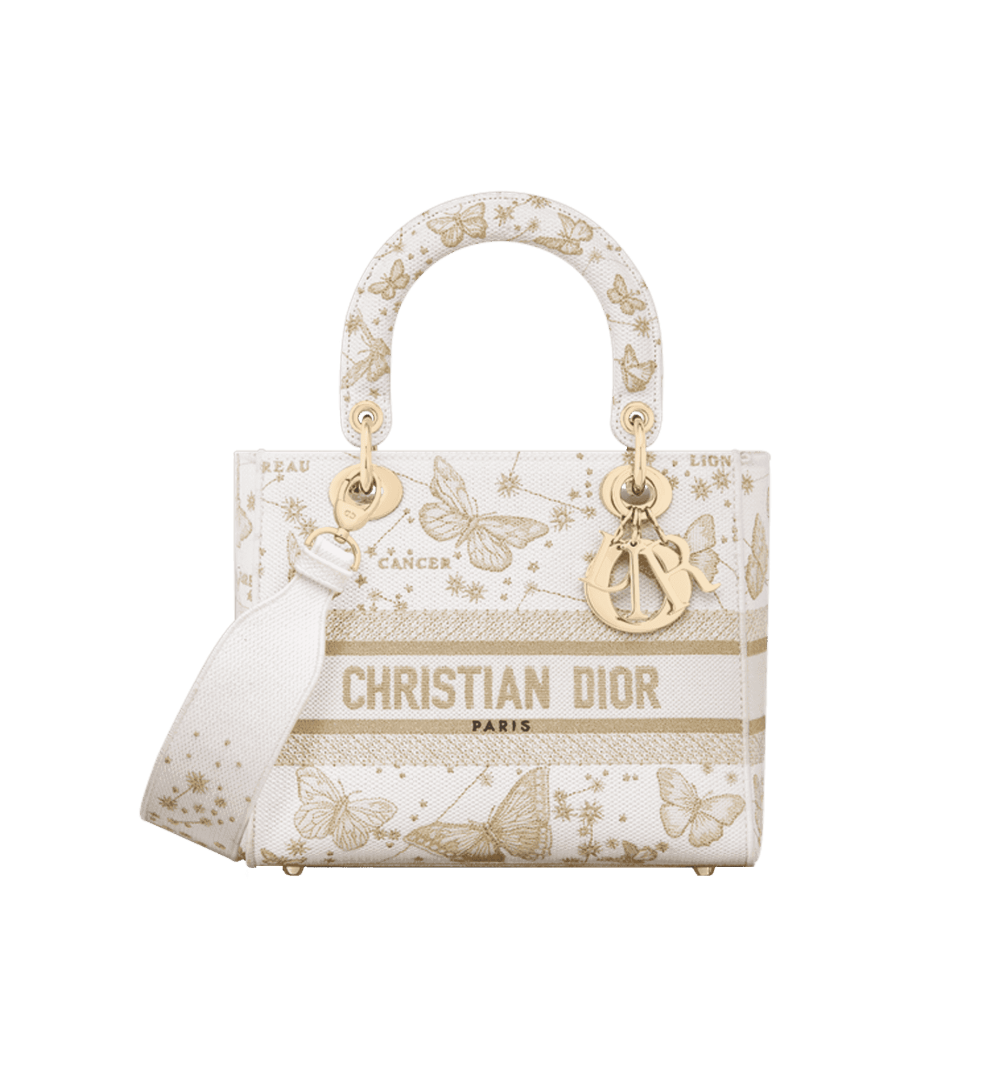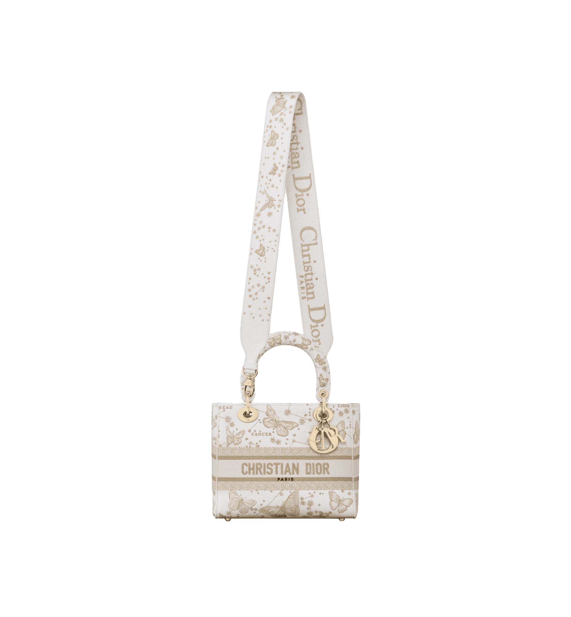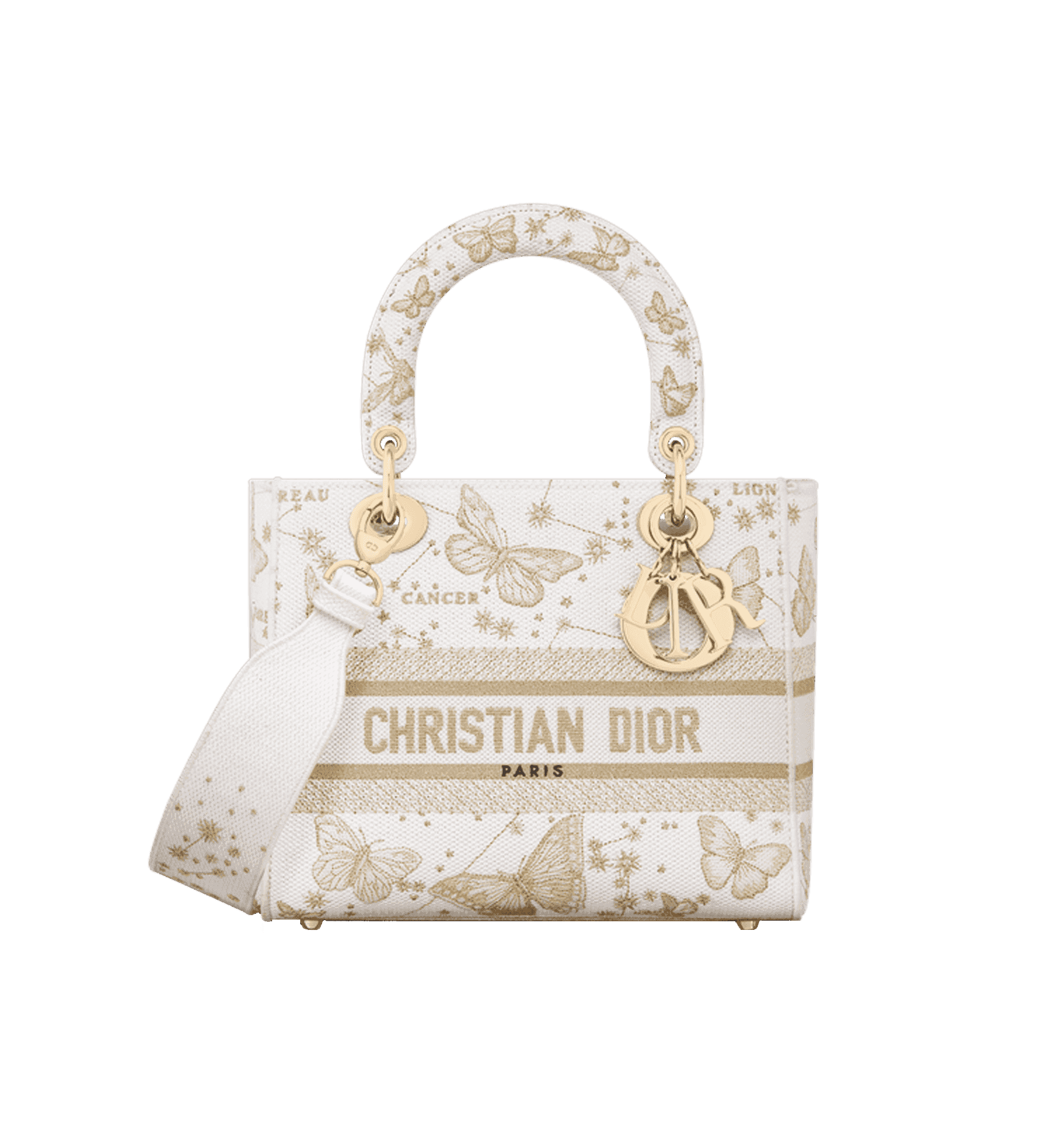 The Lady D-Lite bag combines classic elegance with House modernity. The style is fully embroidered with the white and gold-tone Macrocannage motif. The front features a Christian Dior Paris signature while the D.I.O.R. charms in pale gold-finish metal enhance and illuminate the silhouette. Equipped with a wide, removable embroidered shoulder strap, the medium Lady D-Lite bag can be carried by hand or worn crossbody.