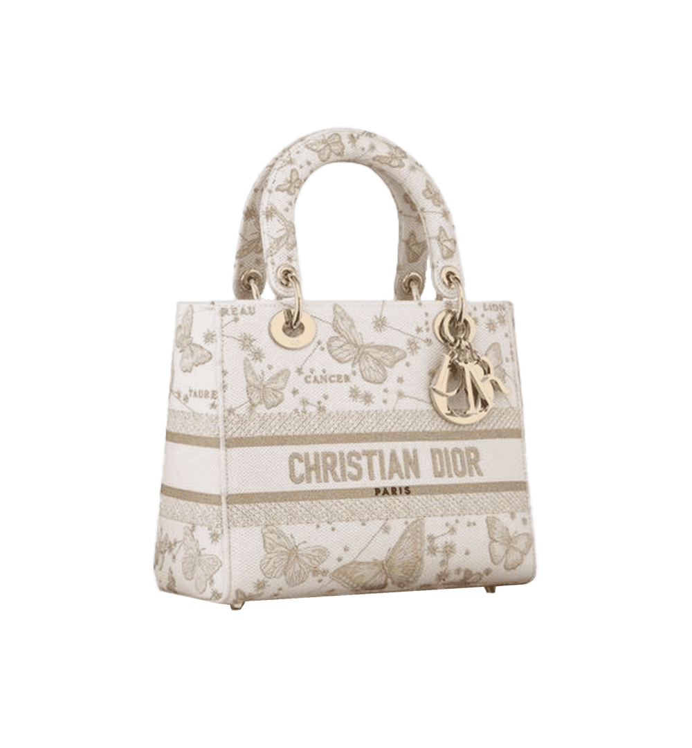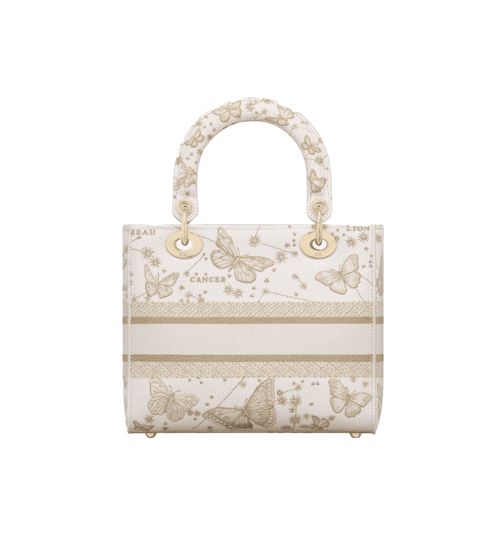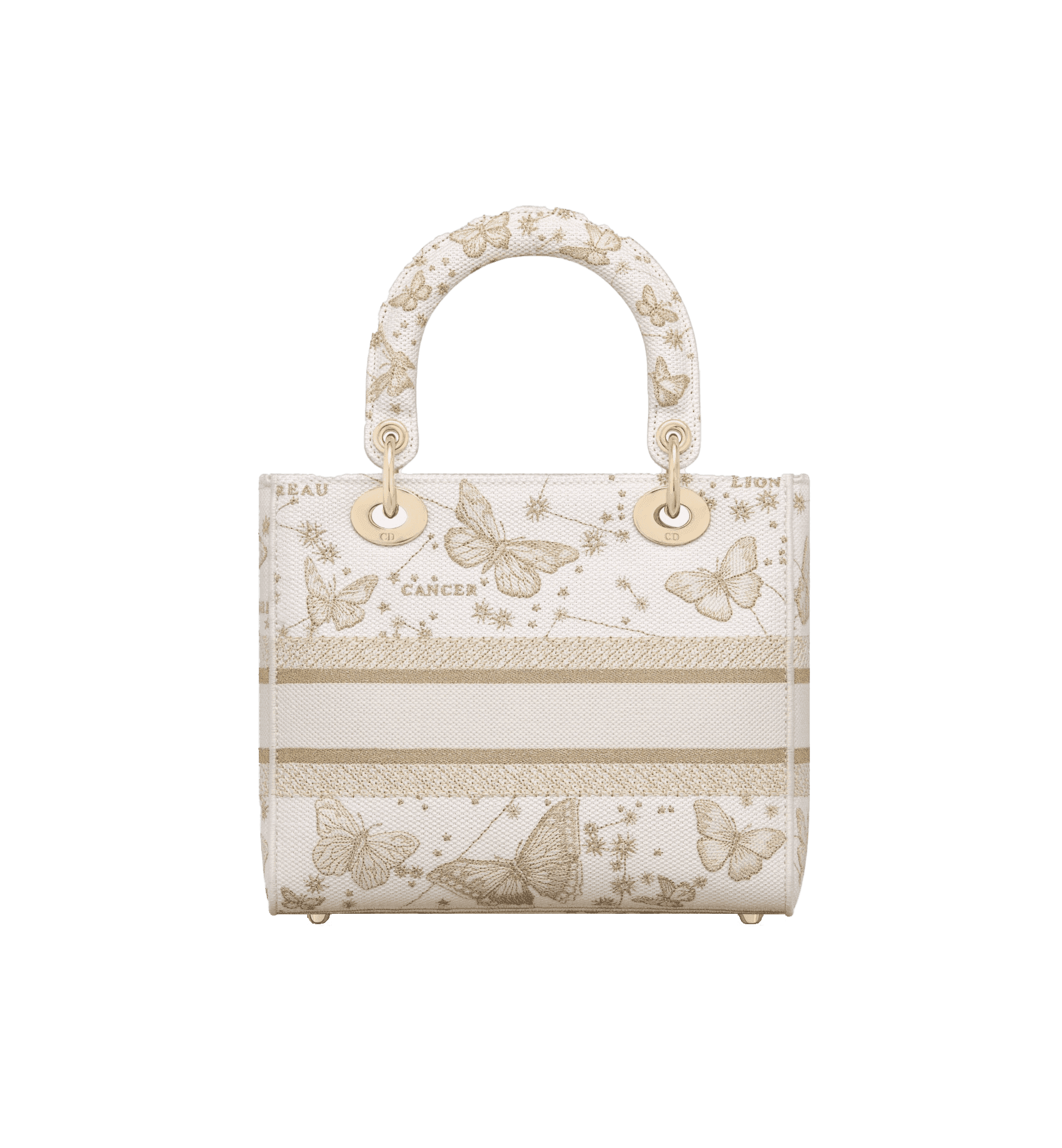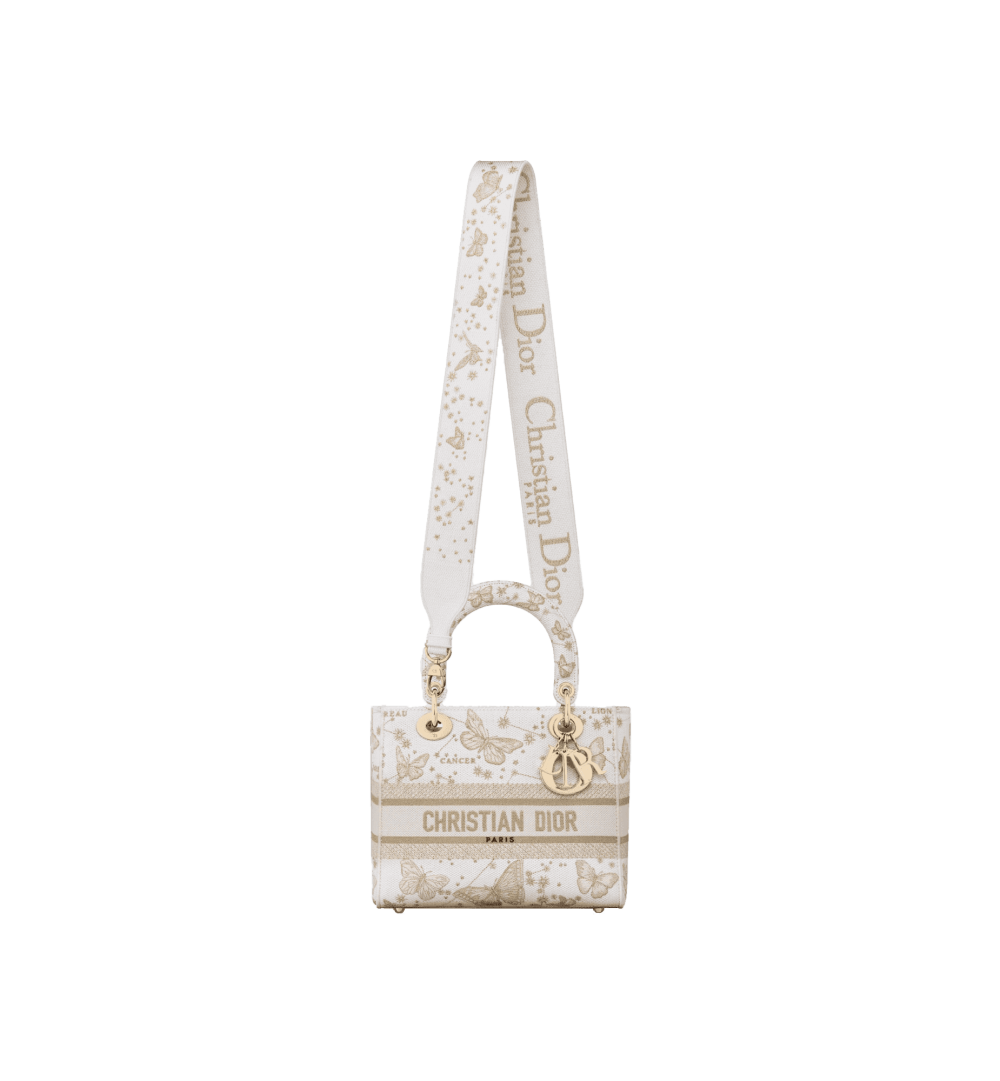 The Lady D-Lite bag combines classic elegance with House modernity. The style is fully embroidered with the white and gold-tone Macrocannage motif. The front features a Christian Dior Paris signature while the D.I.O.R. charms in pale gold-finish metal enhance and illuminate the silhouette. Equipped with a wide, removable embroidered shoulder strap, the medium Lady D-Lite bag can be carried by hand or worn crossbody.