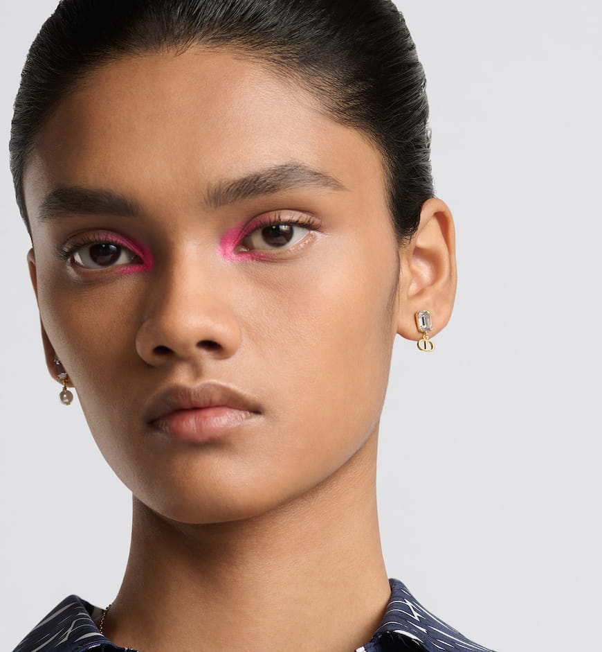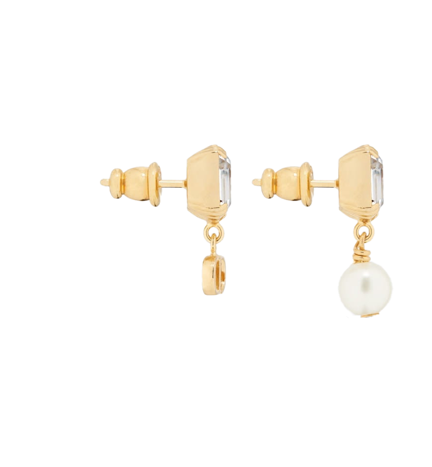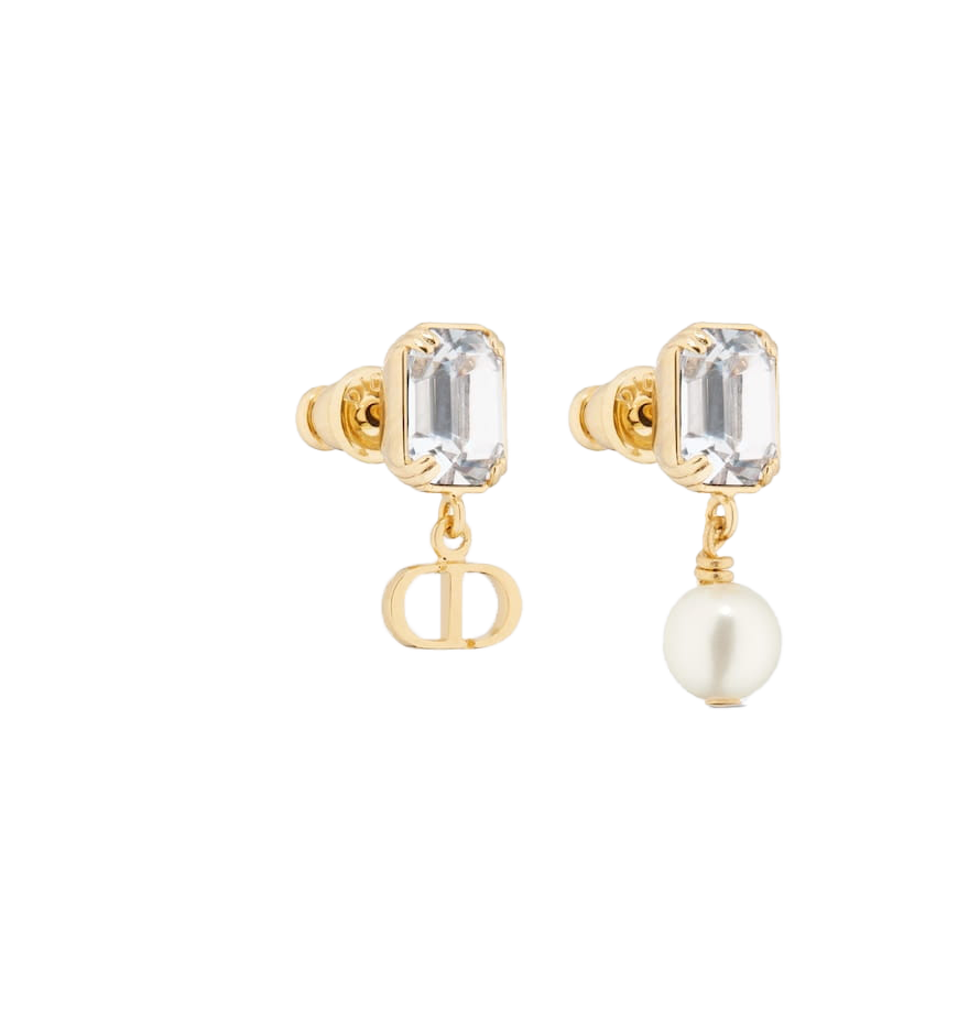 The Petit CD earrings offer elegant and refined appeal. The asymmetric style is distinguished by the gold-finish metal CD signature on one side and a white resin pearl on the other, each suspended from a faceted crystal. The earrings can be styled with other Petit CD creations for a modern and sophisticated look.