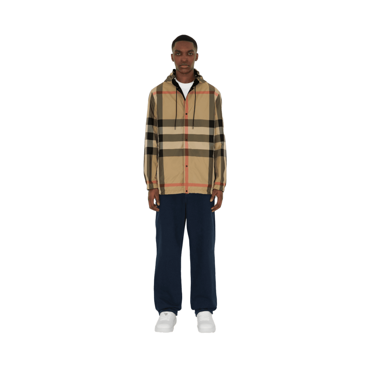 - A reversible hooded jacket in taffeta, switching from a solid colour to the Burberry Check. The style is cut to a regular fit and features an appliquéd logo.
